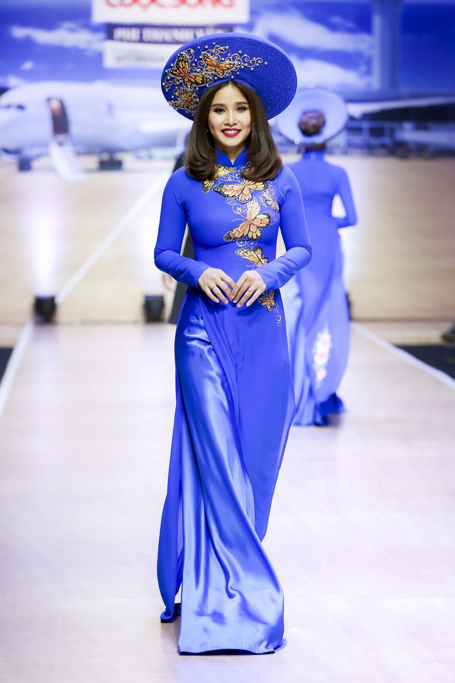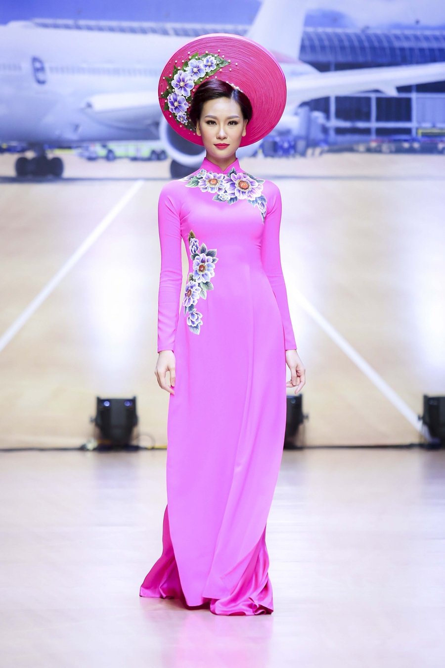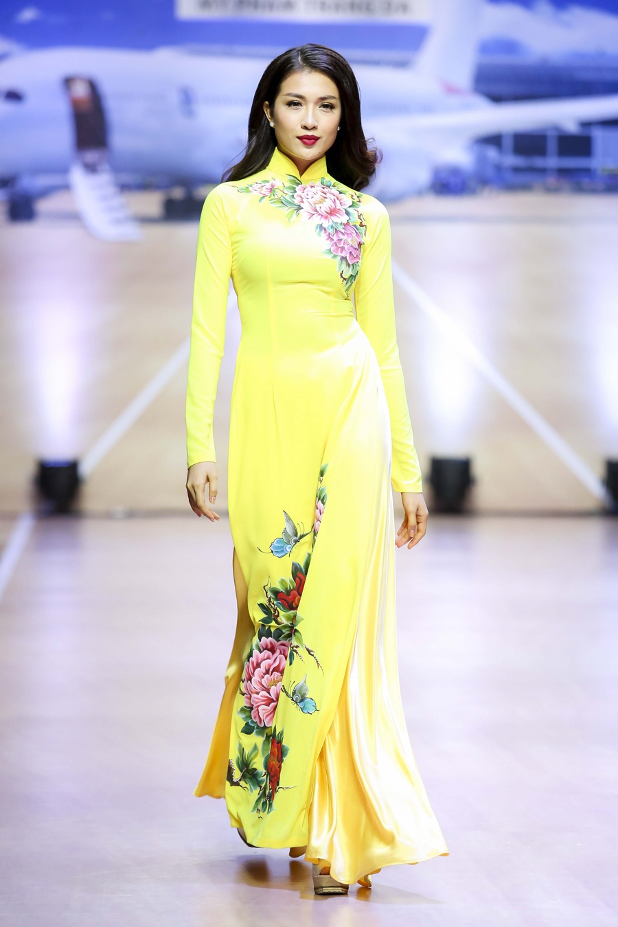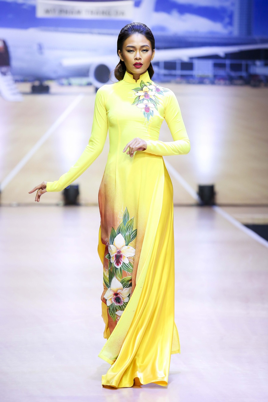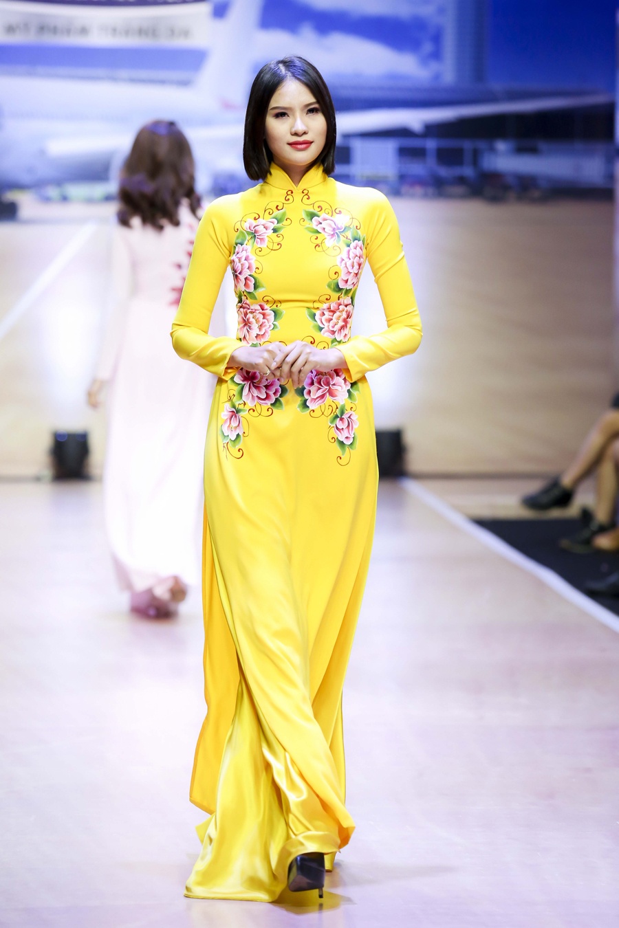 | Tối 25/1, nhà thiết kế Minh Châu giới thiệu bộ sưu tập áo dài xuân mang chủ đề Sắc hoa trên sàn diễn Phong cách và cuộc sống số tháng 1 tại TP HCM. Á hậu Lệ Hằng tham gia trình diễn thiết kế vàng điểm họa tiết hoa cúc nổi bật ở tà áo. |
