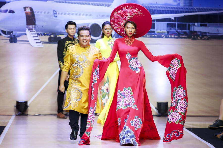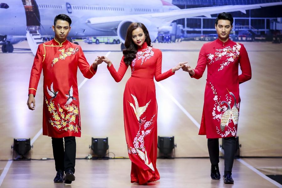 | Kiều Ngân kiêu sa bước lên sàn diễn dùng Hữu Long và Duy Linh. Bộ ba diện áo dài đỏ, thêu họa tiết con cò, nhánh hoa mai tinh xảo ở thân và tà áo. |