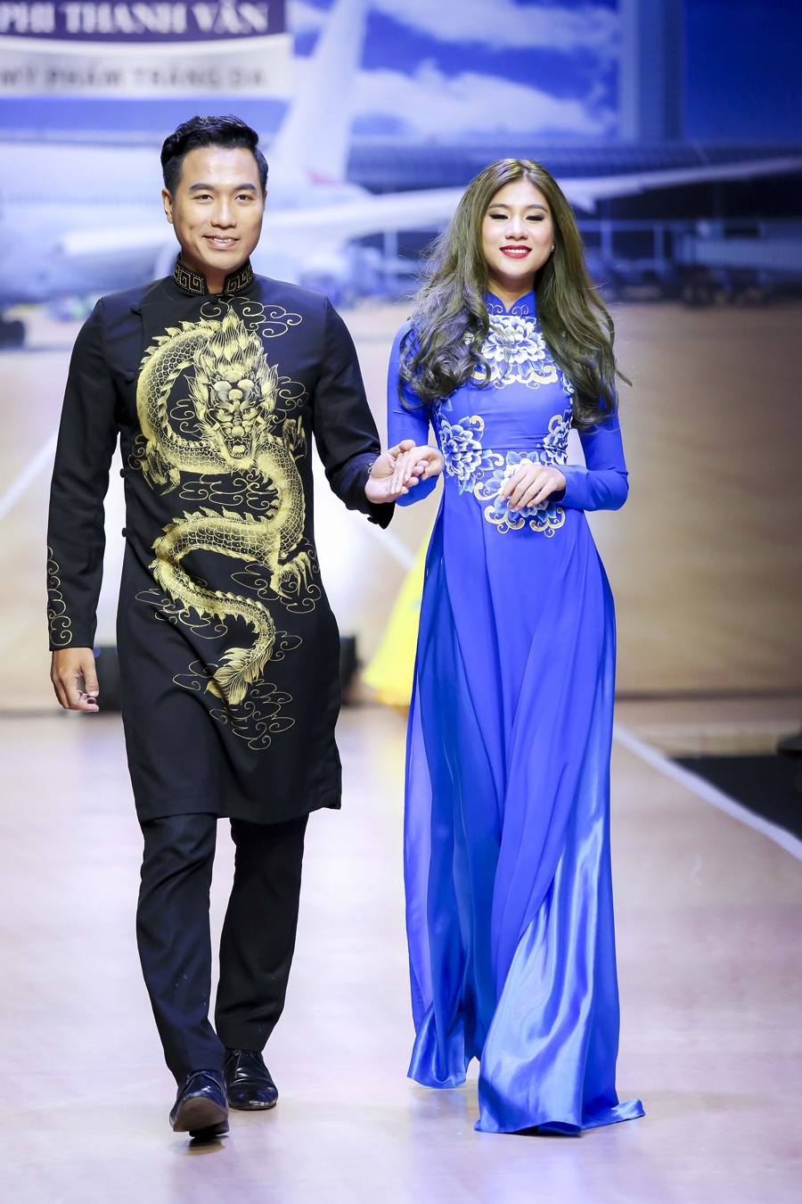 | Minh Triệu đảm nhận vai trò vedette trình diễn thiết kế ấn tượng nhất bộ sưu tập. Nhà thiết kế Minh Châu dìu người mẫu chào khán giản chốt màn. |