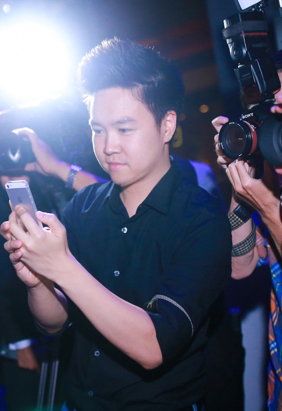 Tối 23/7, nam ca sĩ "Con đường màu xanh" âm thầm đến cổ vũ, cầm điện thoại quay lại màn biểu diễn của chân dài Hà Anh trong buổi giới thiệu MV "Put it on me" tại TP.HCM.