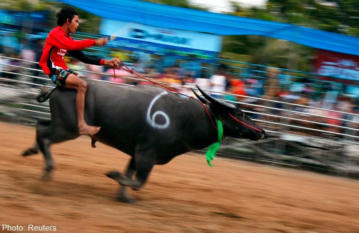 | Một người điều khiển trâu ngã vì trâu chạy với tốc độ quá nhanh. Ảnh: EPA |