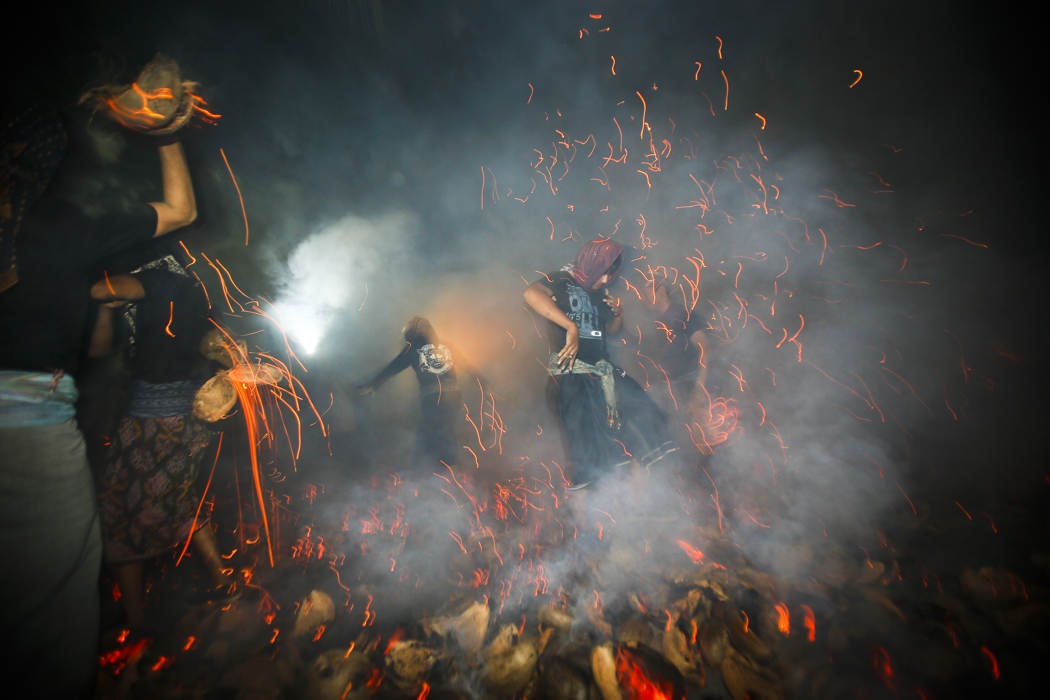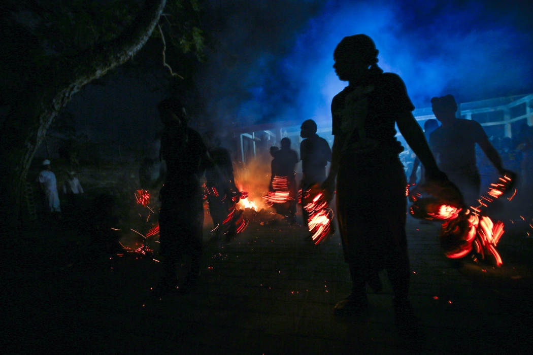 Người ta cũng đi qua những đống lửa cháy trên vỏ quả dừa khô. Ảnh: EPA