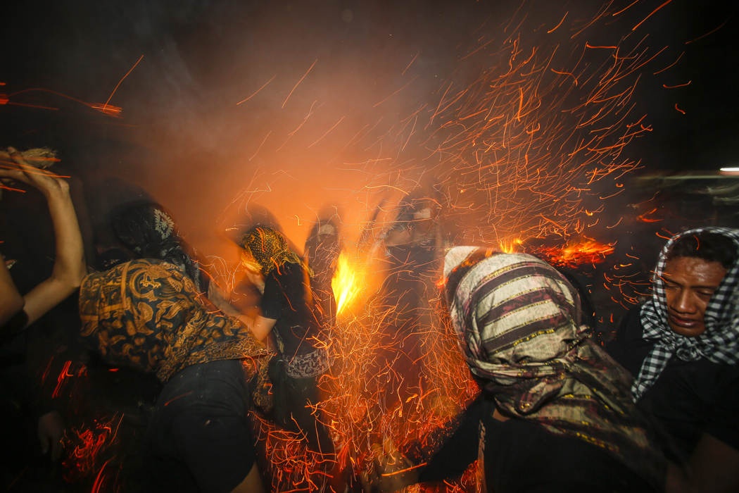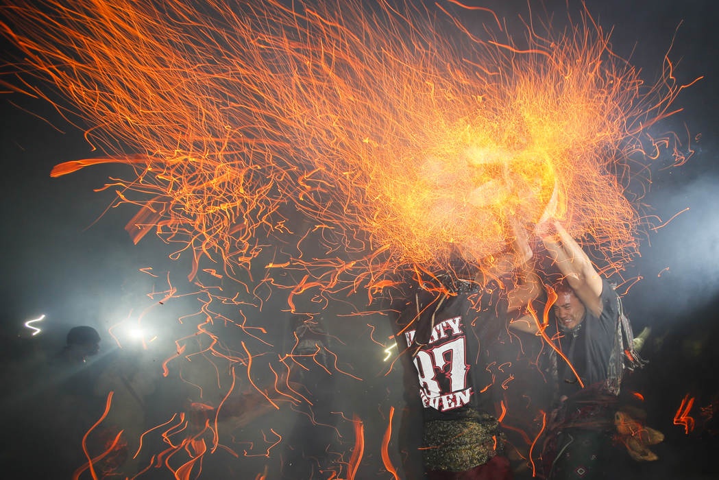 Người dân đốt cháy vỏ quả dừa khô và đập chúng vào nhau để tạo ra tàn lửa đỏ rực trong dịp lễ truyền thống của người Hindu trên đảo Bali, Indonesia.