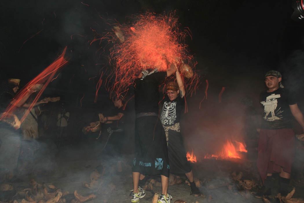 Thậm chí người ta còn ném những vỏ quả dừa đang cháy vào những người khác trong khi nghi lễ diễn ra. Ảnh: EPA