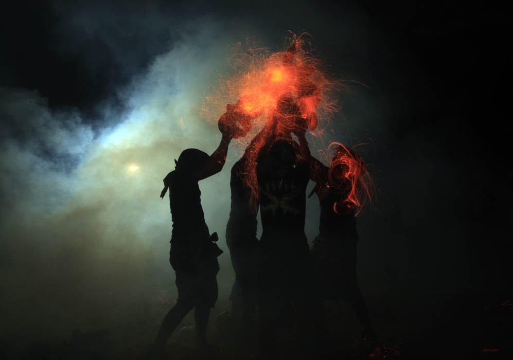Người dân thực hiện nghi lễ ở một ngôi đền tại Tuban trên đảo Bali, Indonesia hôm 9/10. Họ tin rằng tàn lửa sẽ tiêu diệt cái ác, mang lại cuộc sống bình yên cho con người. Mục đích của nghi lễ là giúp con người chống lại sự đeo bám của những thế lực xấu. Ảnh: EPA