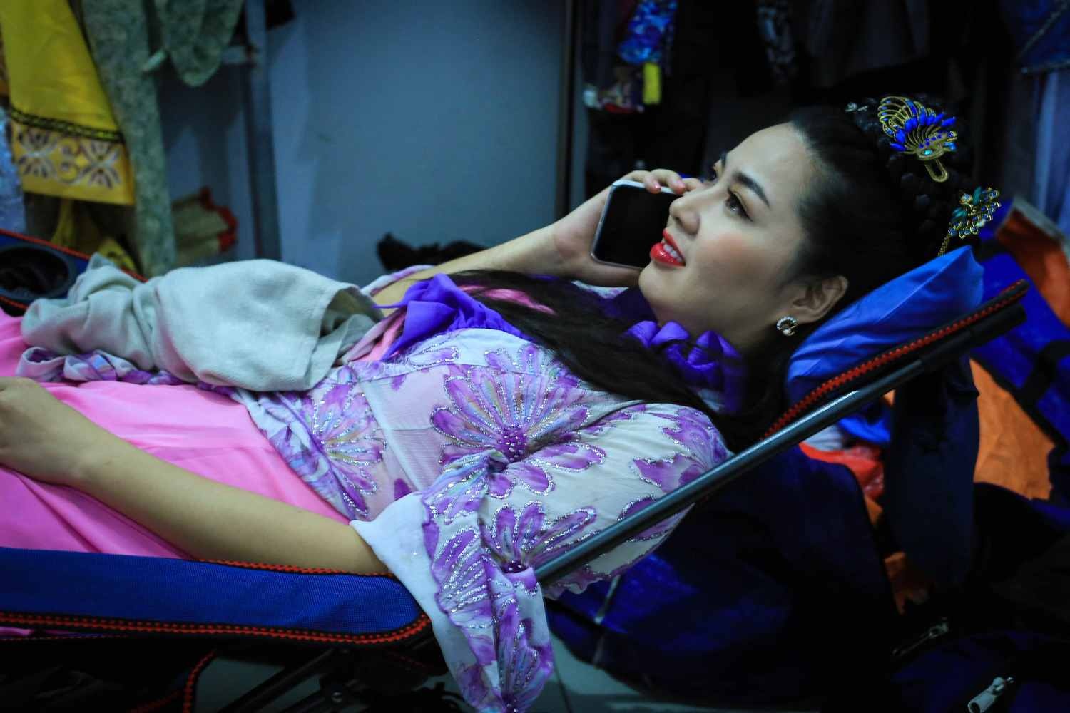 Trong cánh gà, Lê Khánh tranh thủ nghỉ ngơi sau nhiều giờ ghi hình. Nữ diễn viên cũng mang theo ghế nằm để chợp mắt những khi rỗi. |