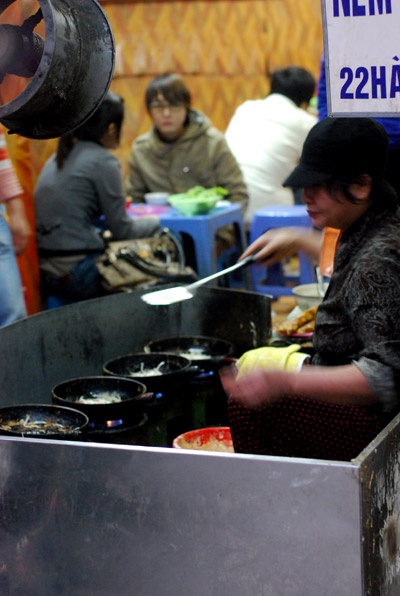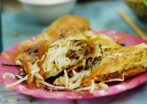 Từ tiệm mỳ gà tần, bách bộ thêm vài bước nữa bạn sẽ bắt gặp một quán bánh xèo rất nổi tiếng. Ở đây chỉ bán buổi chiều (từ tầm 3h đến 6-7h tối). Quán trông khá… lem nhem nhưng thường gây chú ý với các du khách Tây ngang qua đây bởi “công phu làm bánh thâm hậu” của bà chủ. Lúc nào cũng chỉ có một mình, hai tay như một, bà “múa” liên tục với gần chục chiếc chảo xung quanh.