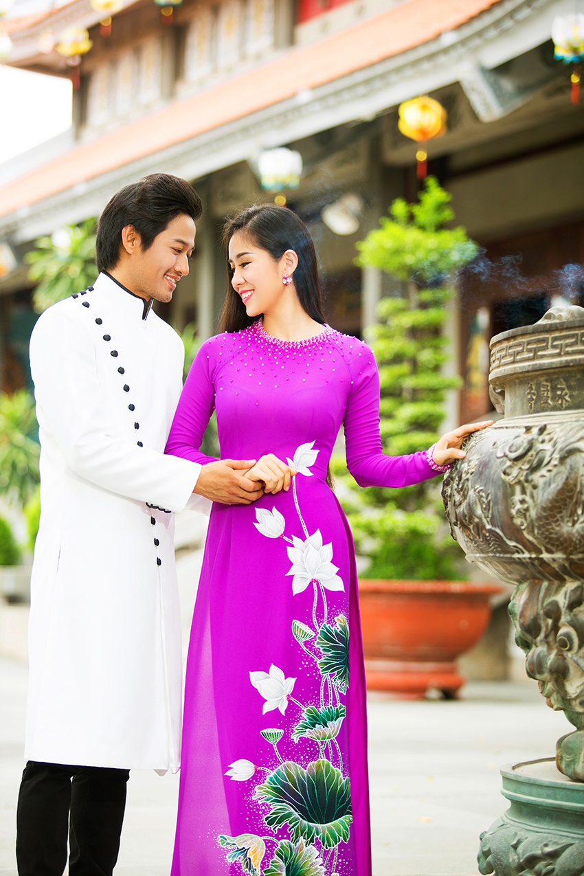 | Thân thiết ngoài đời nên cả hai dễ dàng kết hợp diễn xuất. Trong ảnh, vợ cũ Quách Ngọc Ngoan duyên dáng với áo dài sắc tím, in họa tiết hoa sen tinh tế. Nam diễn viên lịch thiệp với áo dài sắc trắng. |