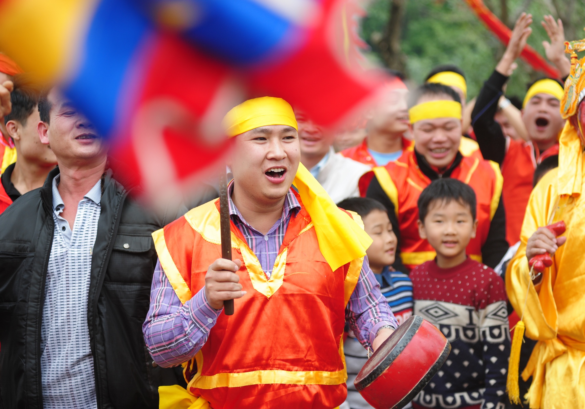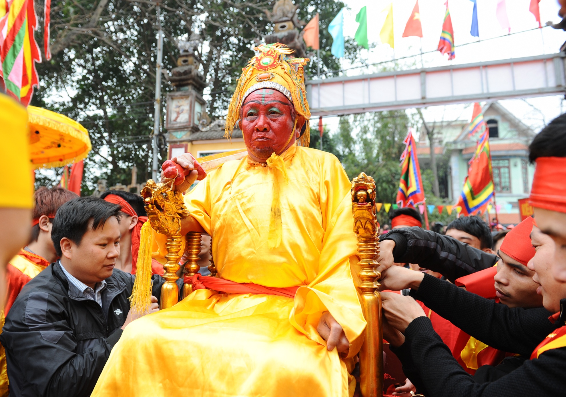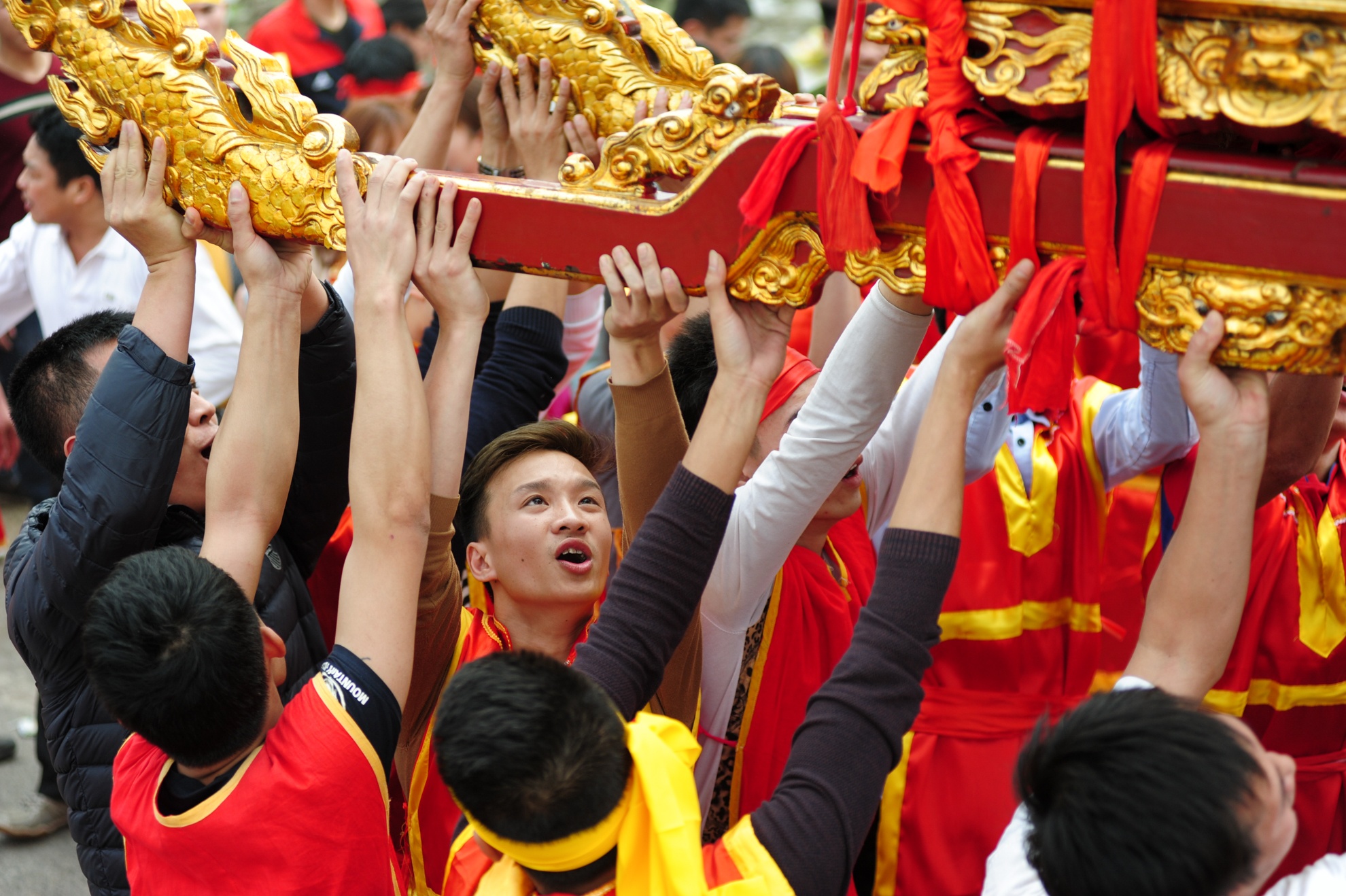 Mỗi kiệu có 12 thanh niên trai tráng khiêng và liên tục thay người để có thể đảm bảo nâng kiệu, hô vang hay chạy nước đại. |