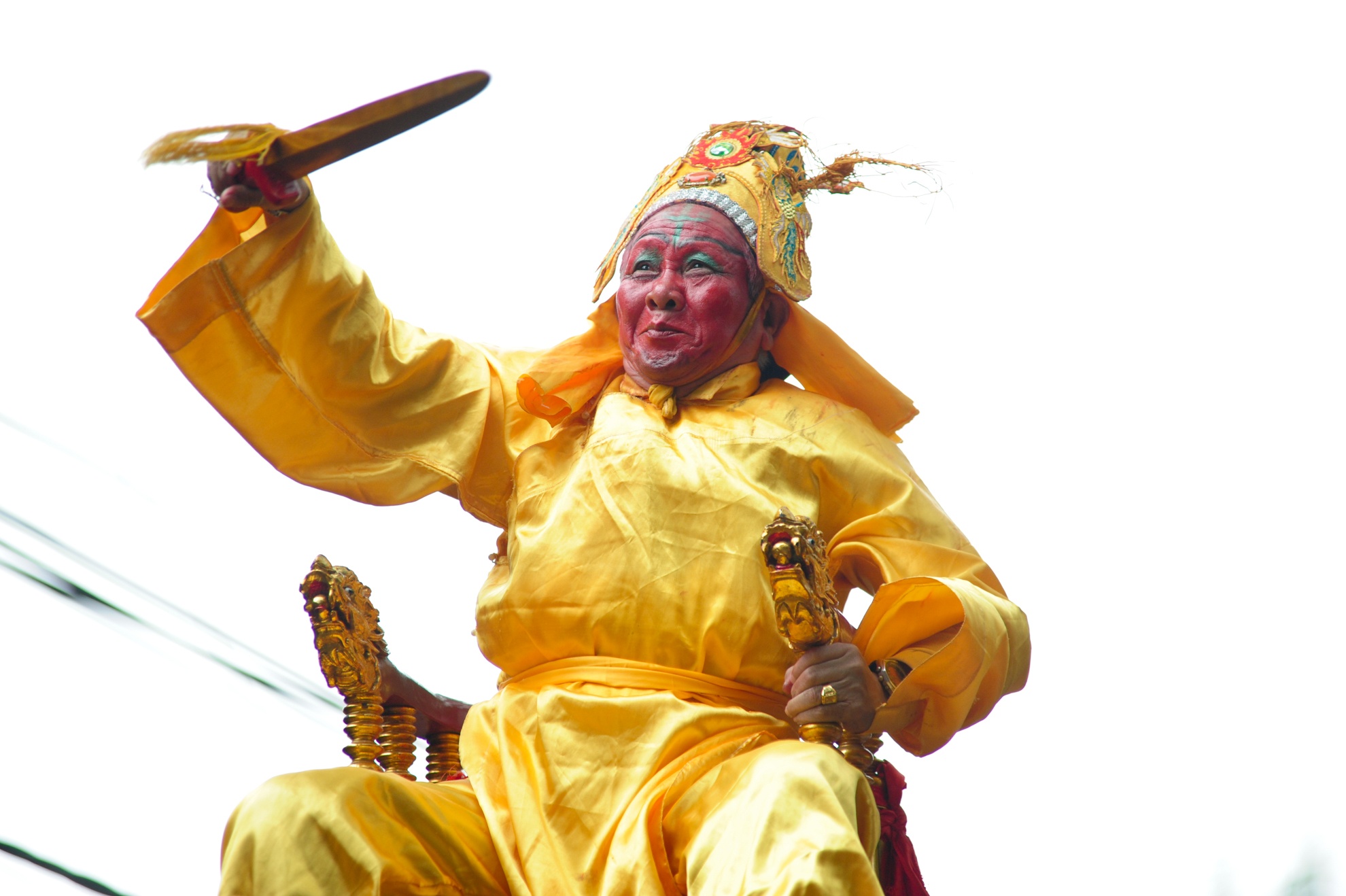 Một tay chúa nắm chặt tay vịn, một tay liên tục hua thanh gươm để khuấy động khí thế. |