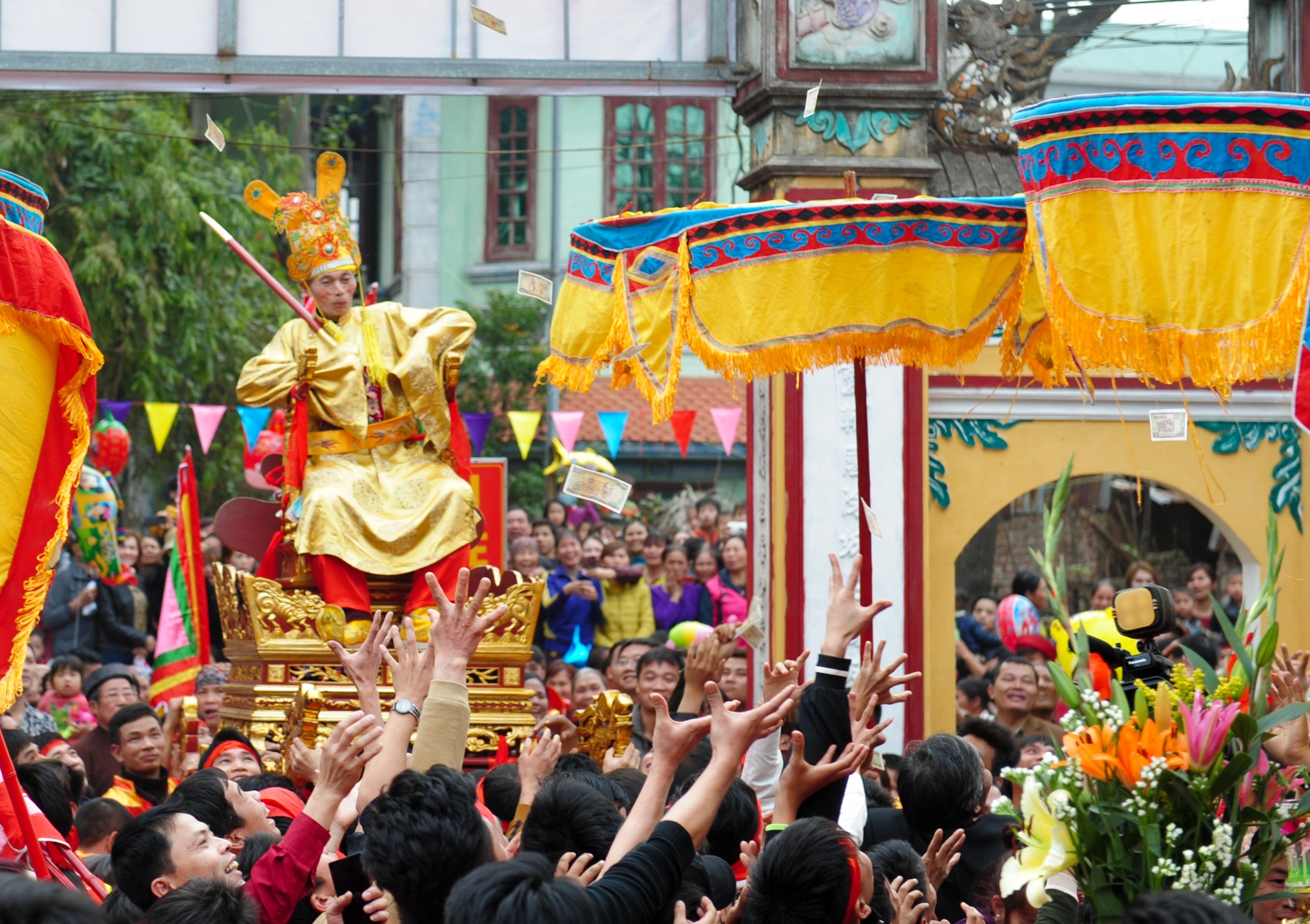 Khi trở về đình, vua và chúa tung cả xấp tiền lẻ để mọi người lấy lộc đầu năm. |