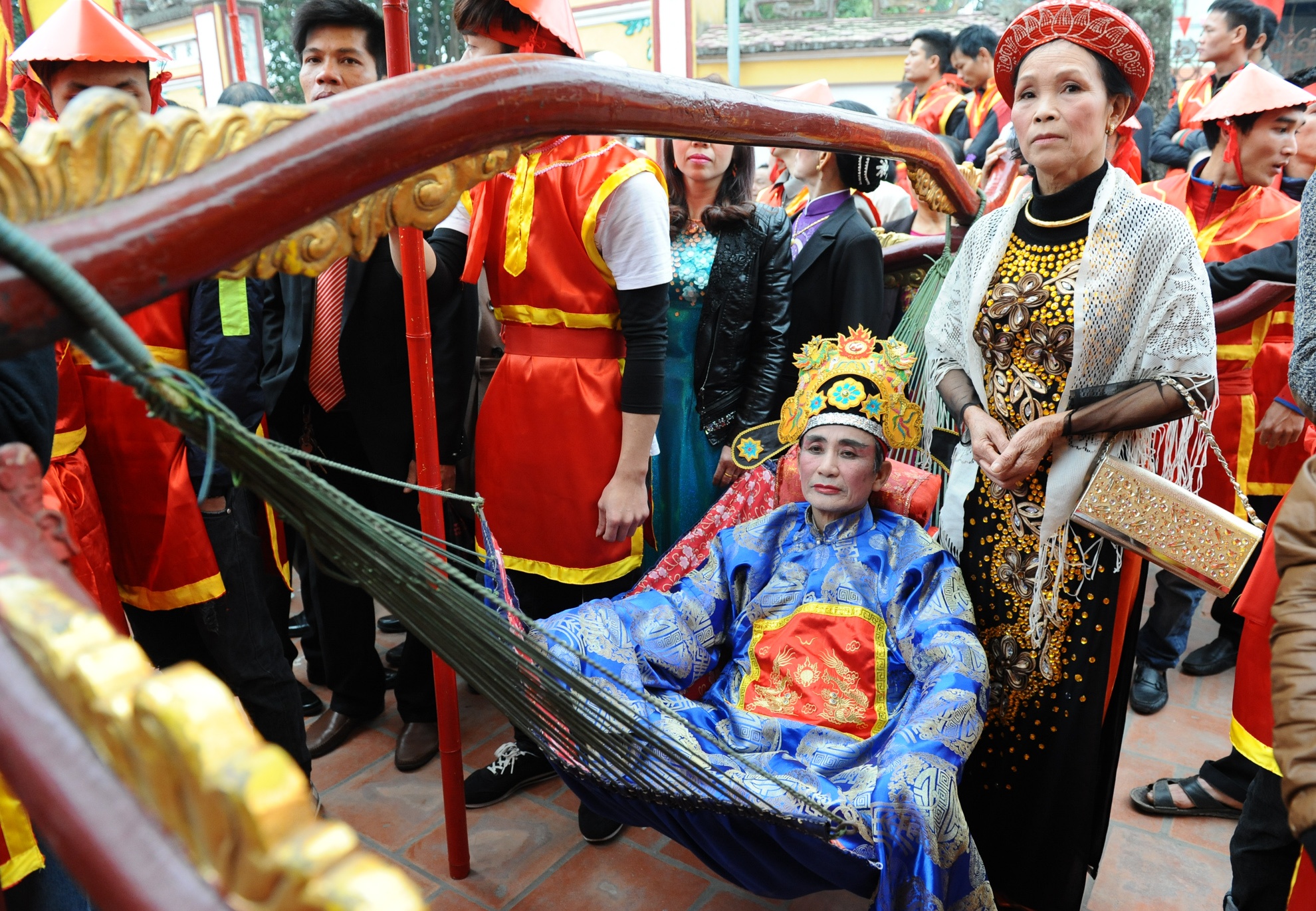 Còn người đóng vai chúa là cụ Lê Đình Thuý, 71 tuổi. Để đảm bảo an toàn khi rước, chúa được dùng dây buộc chặt vào kiệu. |
