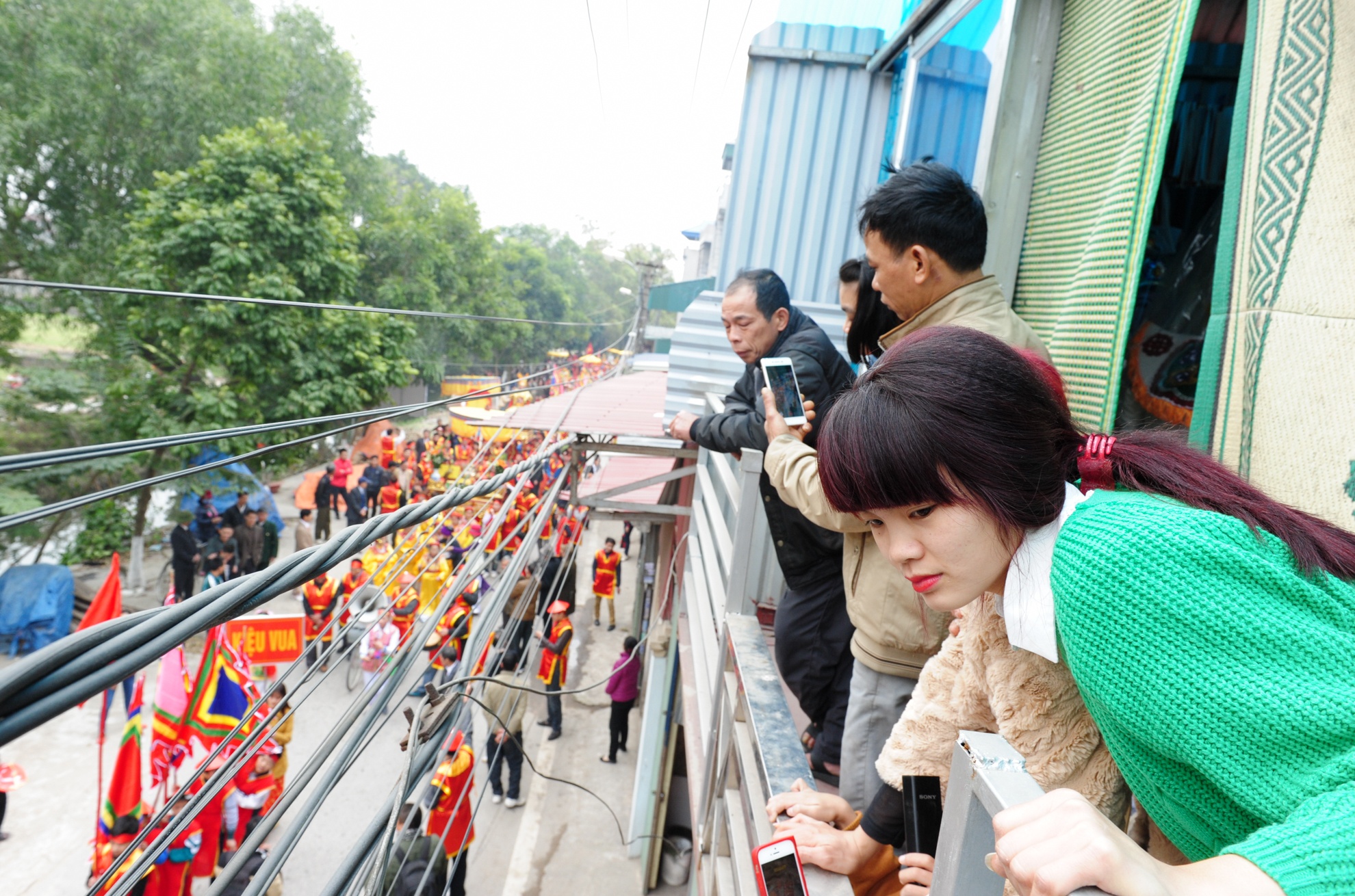 Người dân hai bên đường đổ ra ban công để ngắm đoàn rước đi qua. |
