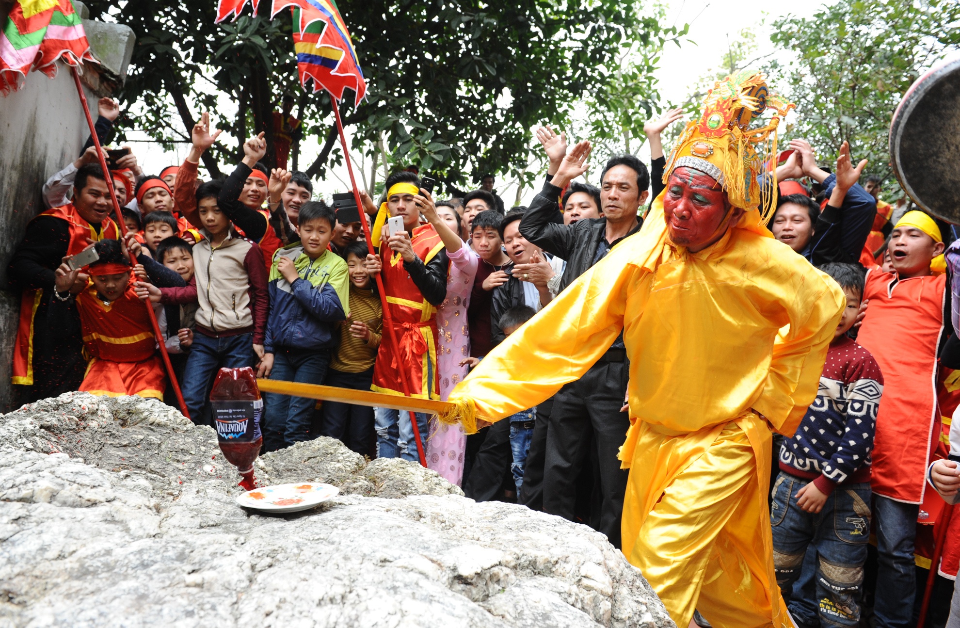 Màn chém gà bằng kiếm gỗ với chai tiết giả thu hút đông đảo người xem ở sân sau đền Thượng. Tương truyền ma gà trắng núp dưới chân núi Thất Diệu Sơn bị thần Huyền Thiên Trấn Vũ ra tay tiêu diệt nên vua Thục mới xây xong thành Cổ Loa. |