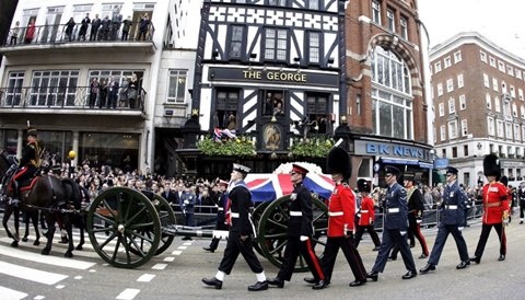 Cựu Thủ tướng Anh Margaret Thatcher qua đời ngày 8/4/2013 sau một cơn đột quỵ. Tang lễ của "Người đàn bà thép" được tổ chức ngày 17/4. 2.300 quan khách, trong đó có Nữ hoàng Anh Elizabeth II và đại diện đến từ 170 quốc gia trên thế giới, đã tham dự tang lễ bà Thatcher tại nhà thờ Thánh Paul ở London. Ảnh: AFP