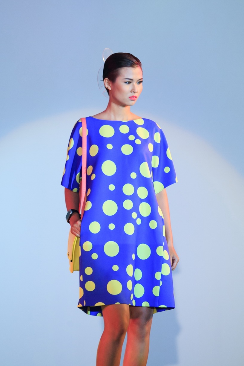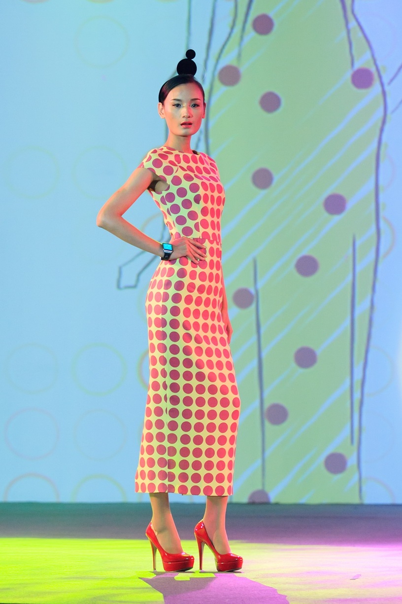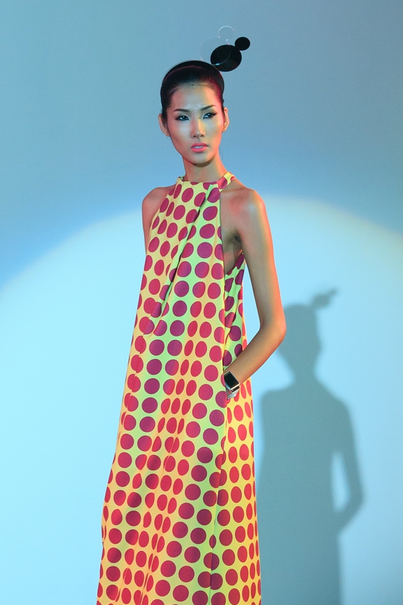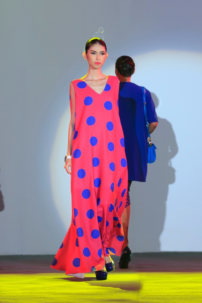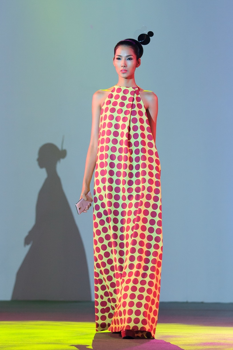 Lê Thúy tự tin sải bước với thiết kế chấm bi tông hồng trên nền vải có gam màu vàng ngọt ngào.