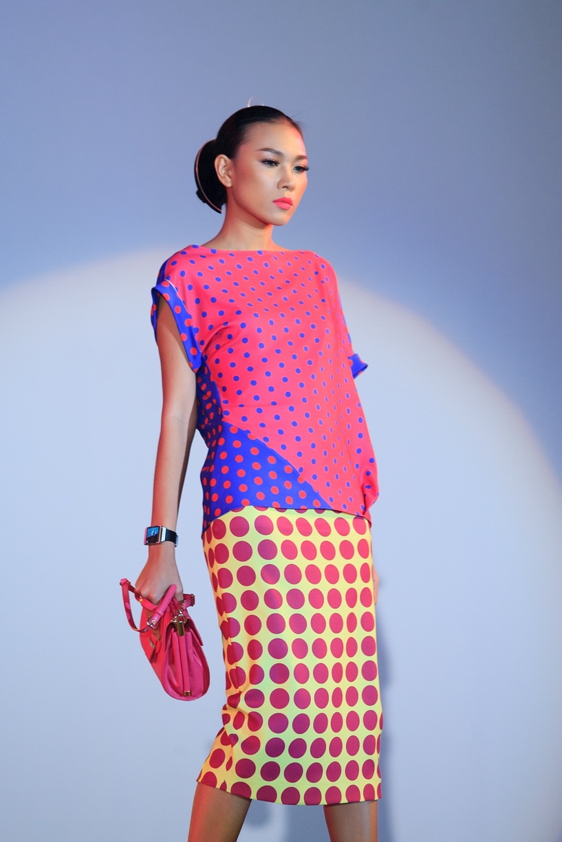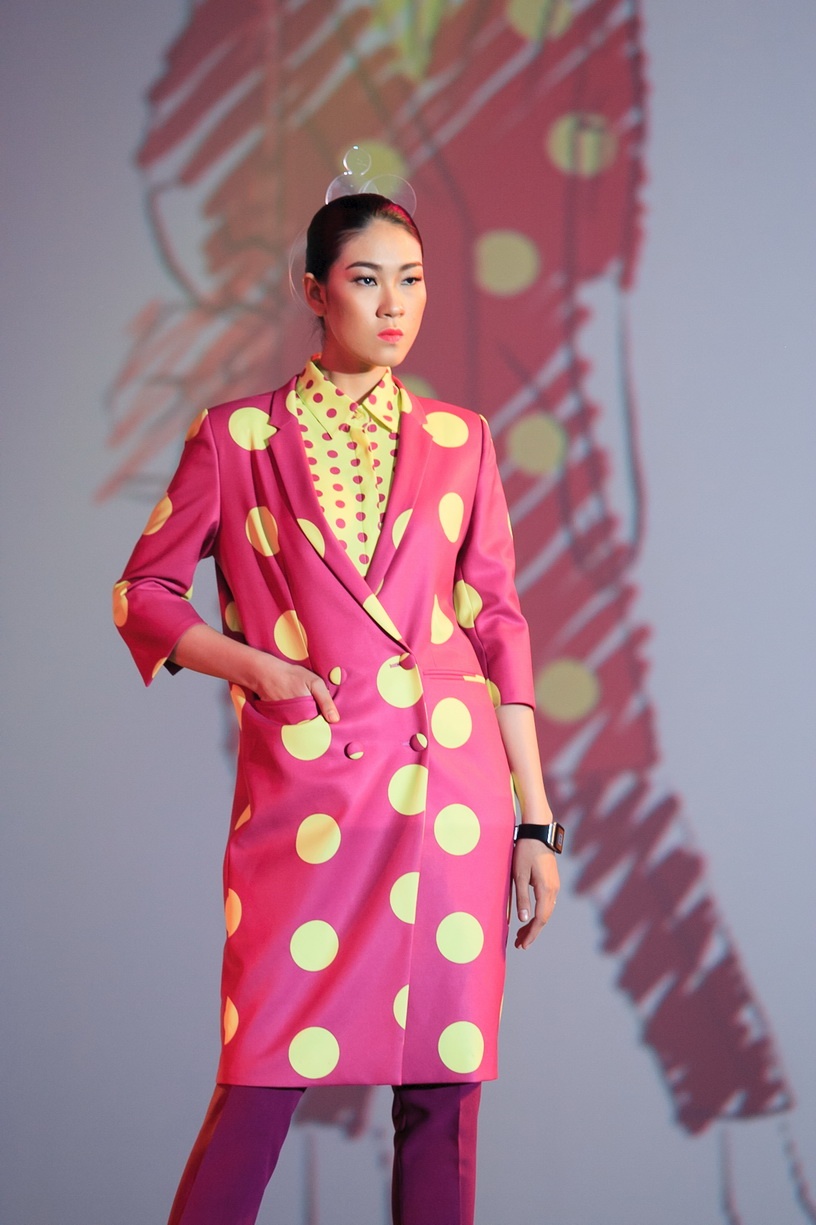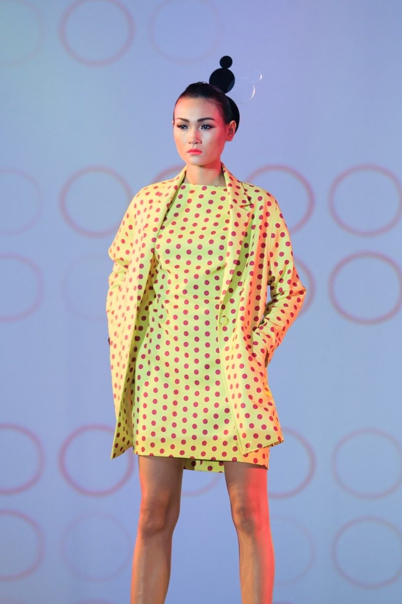 Họa tiết chấm bi xuyên suốt toàn bộ BST. Cách phối hợp áo vest mỏng và chân váy bút chì tạo phong cách cổ điển. Người mẫu Phương Nghi.