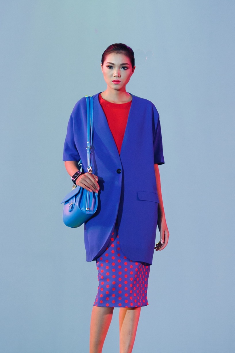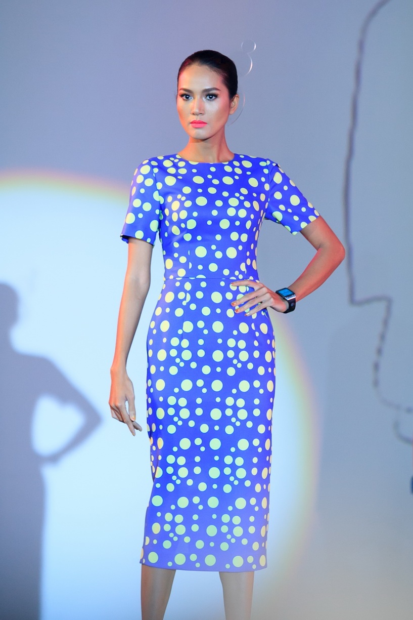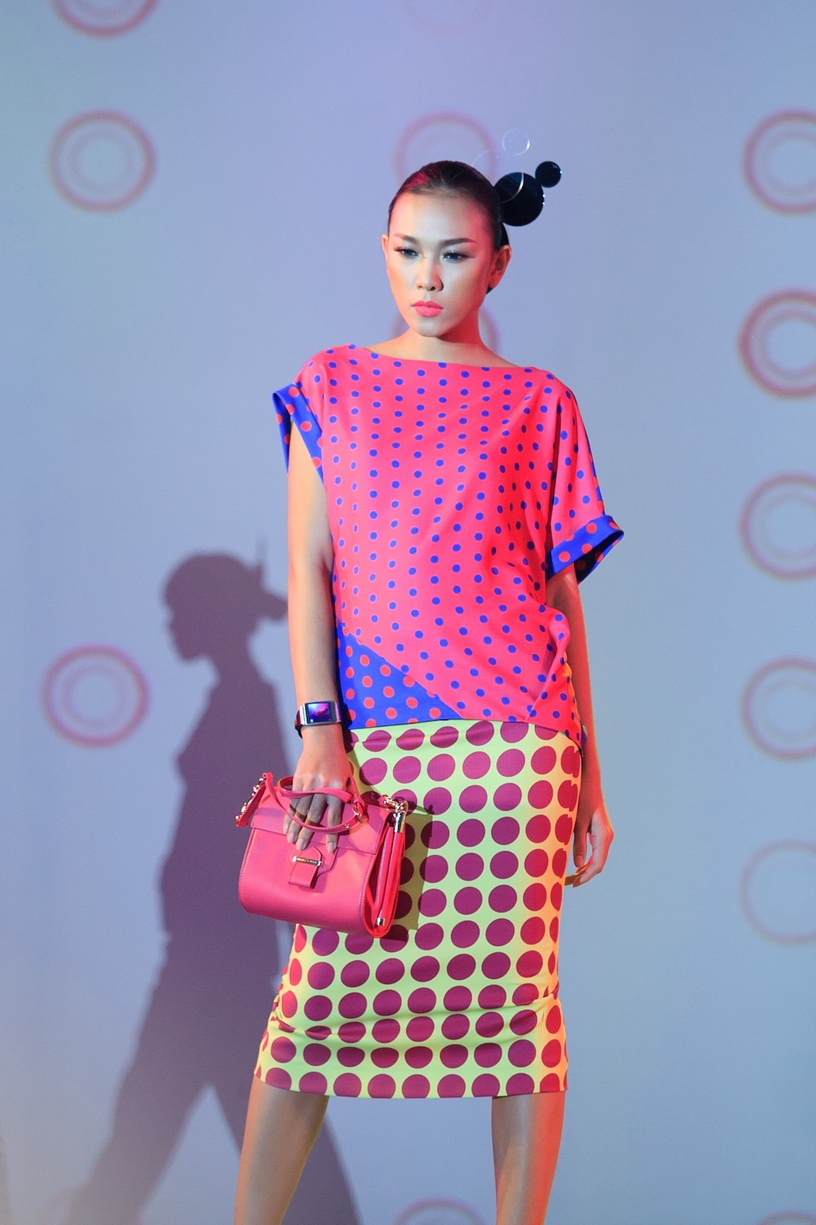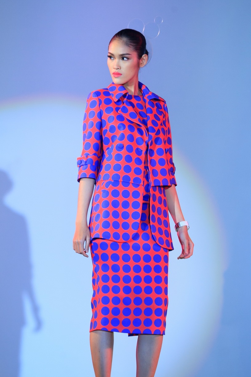 Họa tiết chấm bi xuyên suốt toàn bộ BST. Cách phối hợp áo vest mỏng và chân váy bút chì tạo phong cách cổ điển. Người mẫu Phương Nghi.