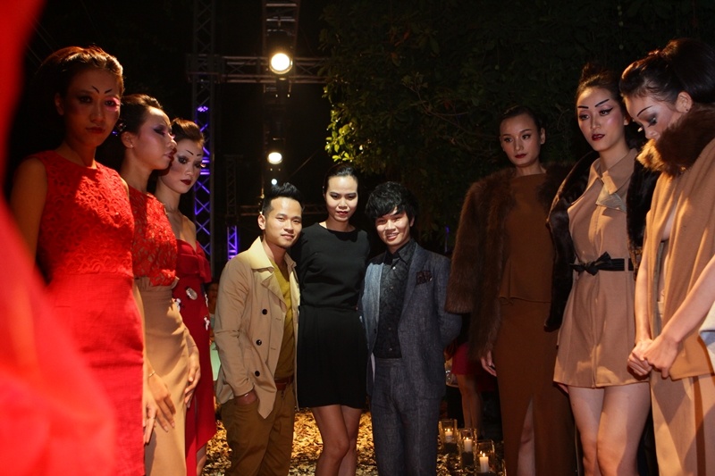 | Nhà thiết kế Hoàng Ngân, làm tóc Trần Hùng, chuyên gia trang điểm Hoàn Khang và dàn mẫu trong đêm diễn. |