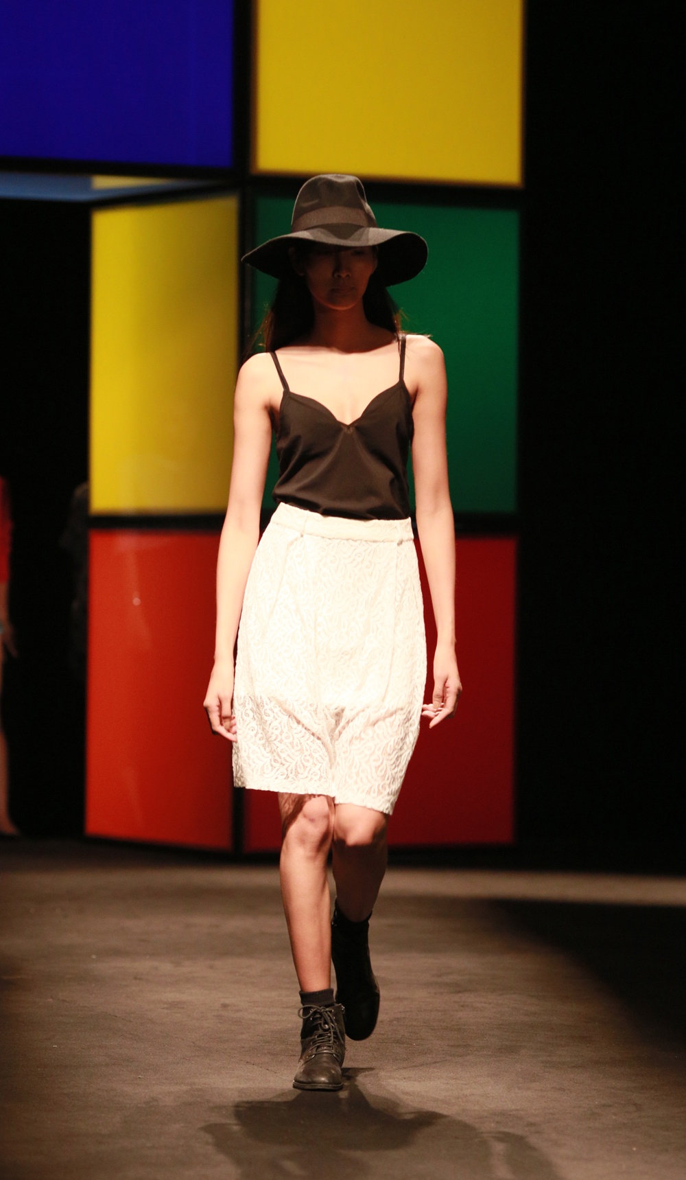 Đến buổi tổng duyệt, Hoàng Thùy diện trang phục đơn giản với tông màu trắng đen. Mốt áo ngủ hai dây mix ăn ý cùng chân váy trắng nền nã. Phụ kiện mũ fedora và boots cổ ngắn luôn đồng hành cùng người đẹp.