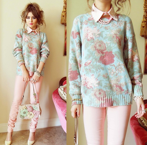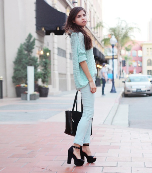 Cô bạn gái đã rất khéo léo khi mix len xanh bạc hà với quần skinny mang họa tiết của những bông hoa hồng.