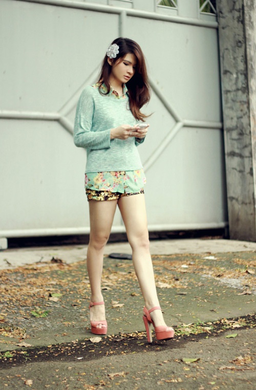 Phong cách mang hơi thở mùa xuân với sơ mi hoa, quần short và chiếc áo len mỏng.
