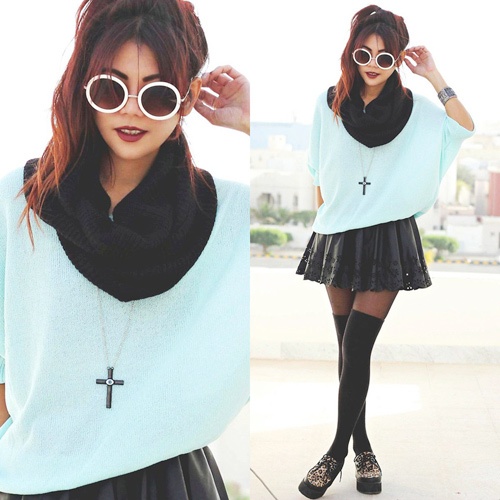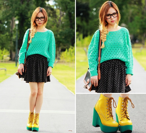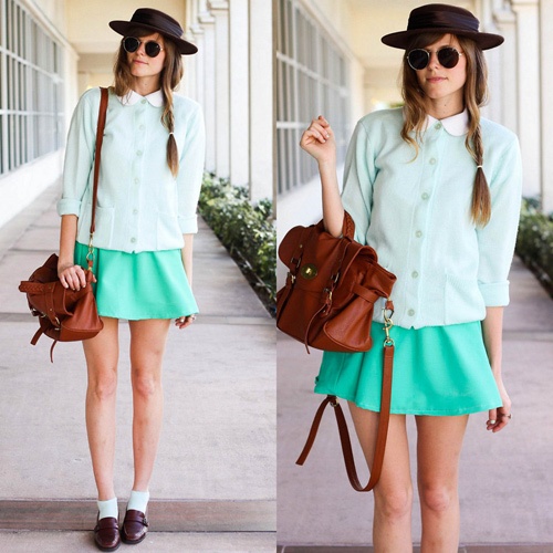 Những cô gái cá tính hẳn sẽ không bỏ qua cách mix rất thú vị của len xanh bạc hà và chân váy xòe chấm bi.