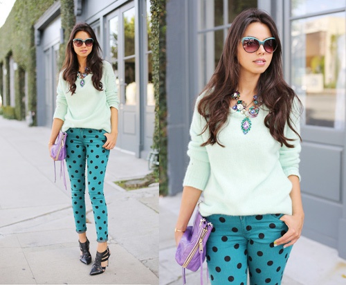 | Len xanh bạc hà mix trẻ trung với quần xanh chấm bi cho ngày xuống phố. |