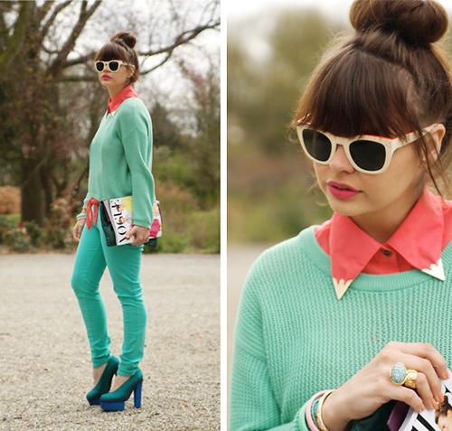 Xanh bạc hà mix ăn ý với xanh ngọc và sơ mi cam rực rỡ.