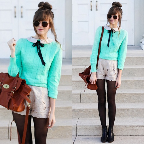 Trẻ trung xuống phố với quần short và một chiếc áo len xanh mang phong cách cổ điển.