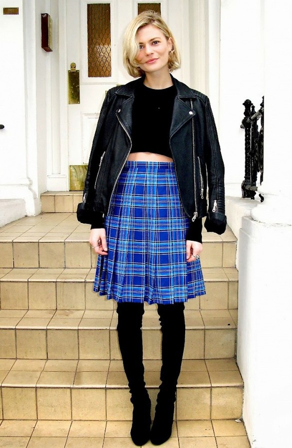 Một cách kết hợp cá tính với áo lửng, váy xòe và khoác da đen.