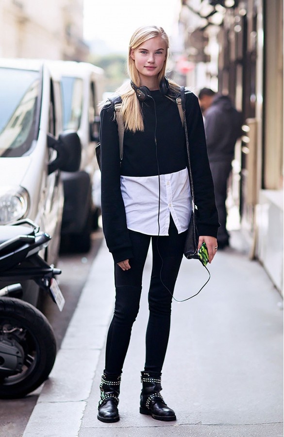 Một gợi ý cho cô nàng cá tính với áo sơ mi trắng, crop top đen và bốt khi xuống phố.