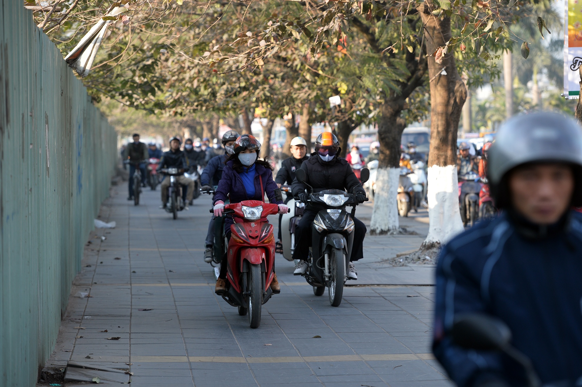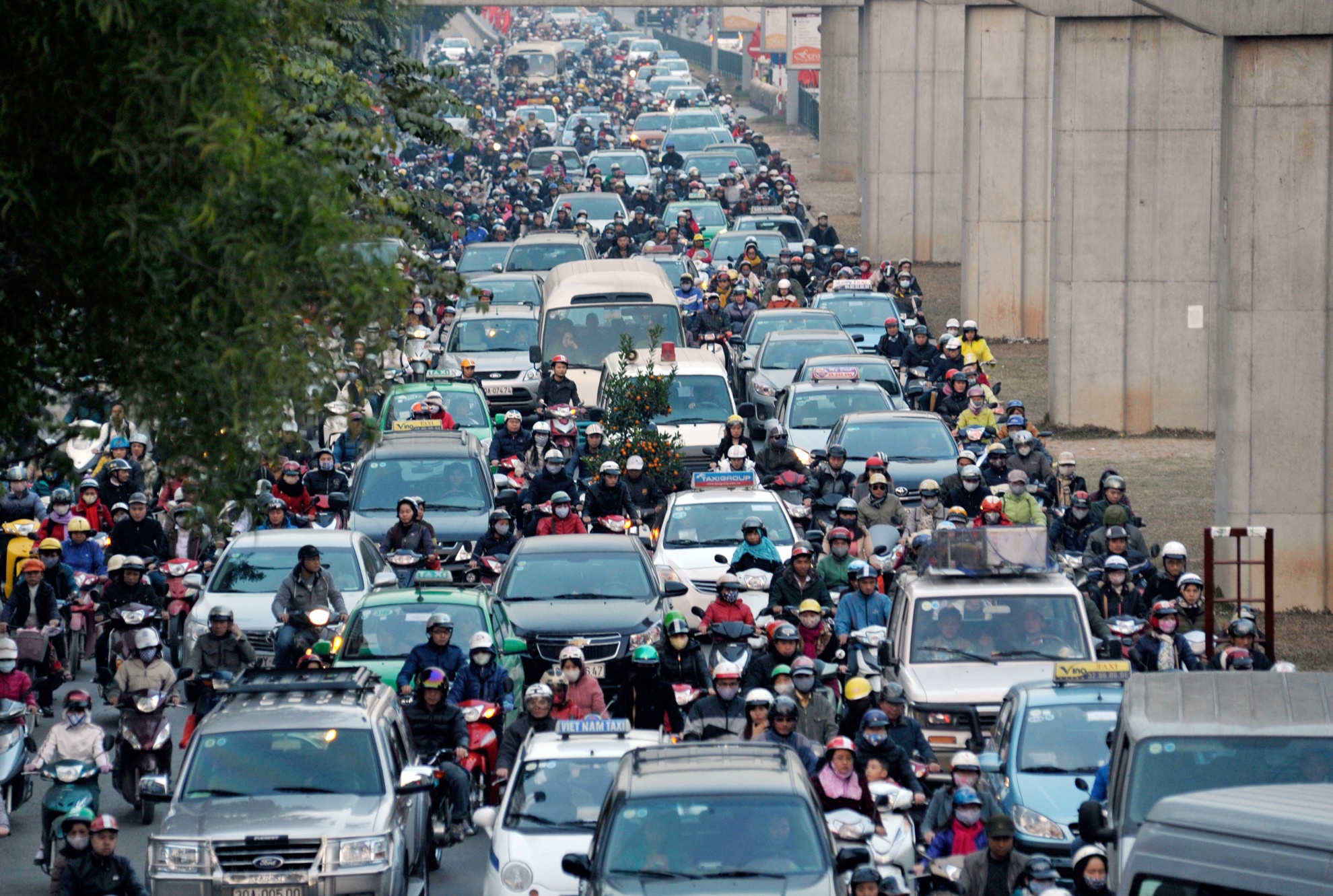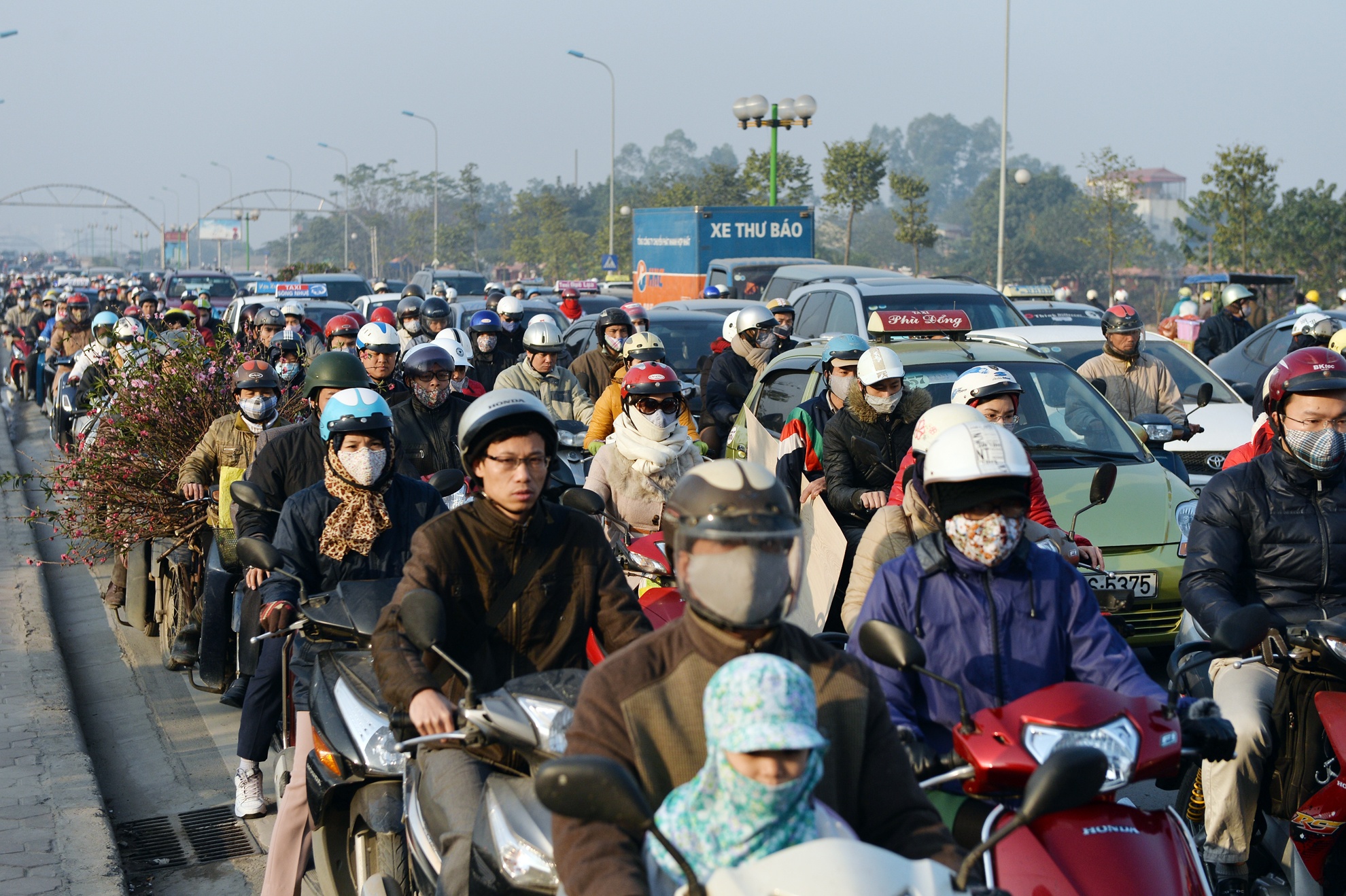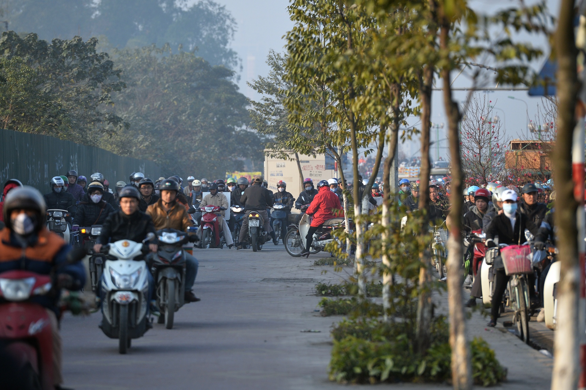 Nhiều tuyến phố ùn tắc hàng km, người dân lao xe máy lên đường tàu, vỉa hè. Hà Nội những ngày cận Tết, hình ảnh khói xe xen lẫn đào quất.