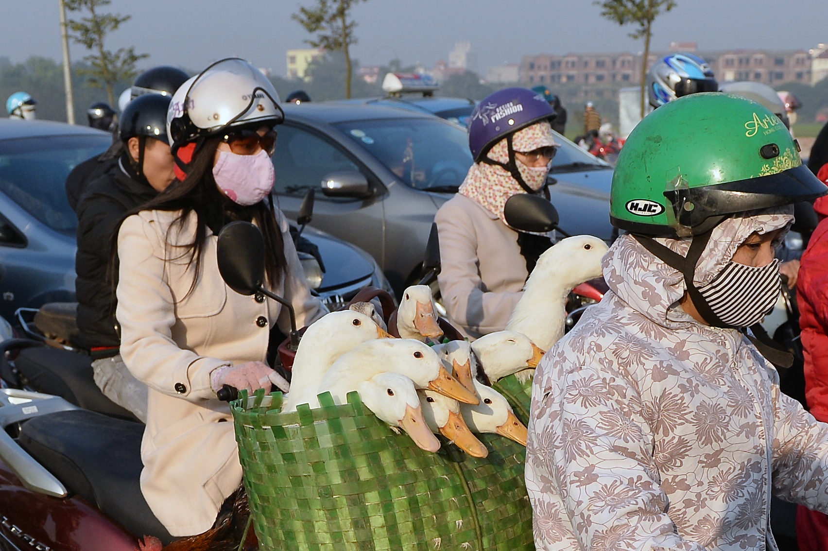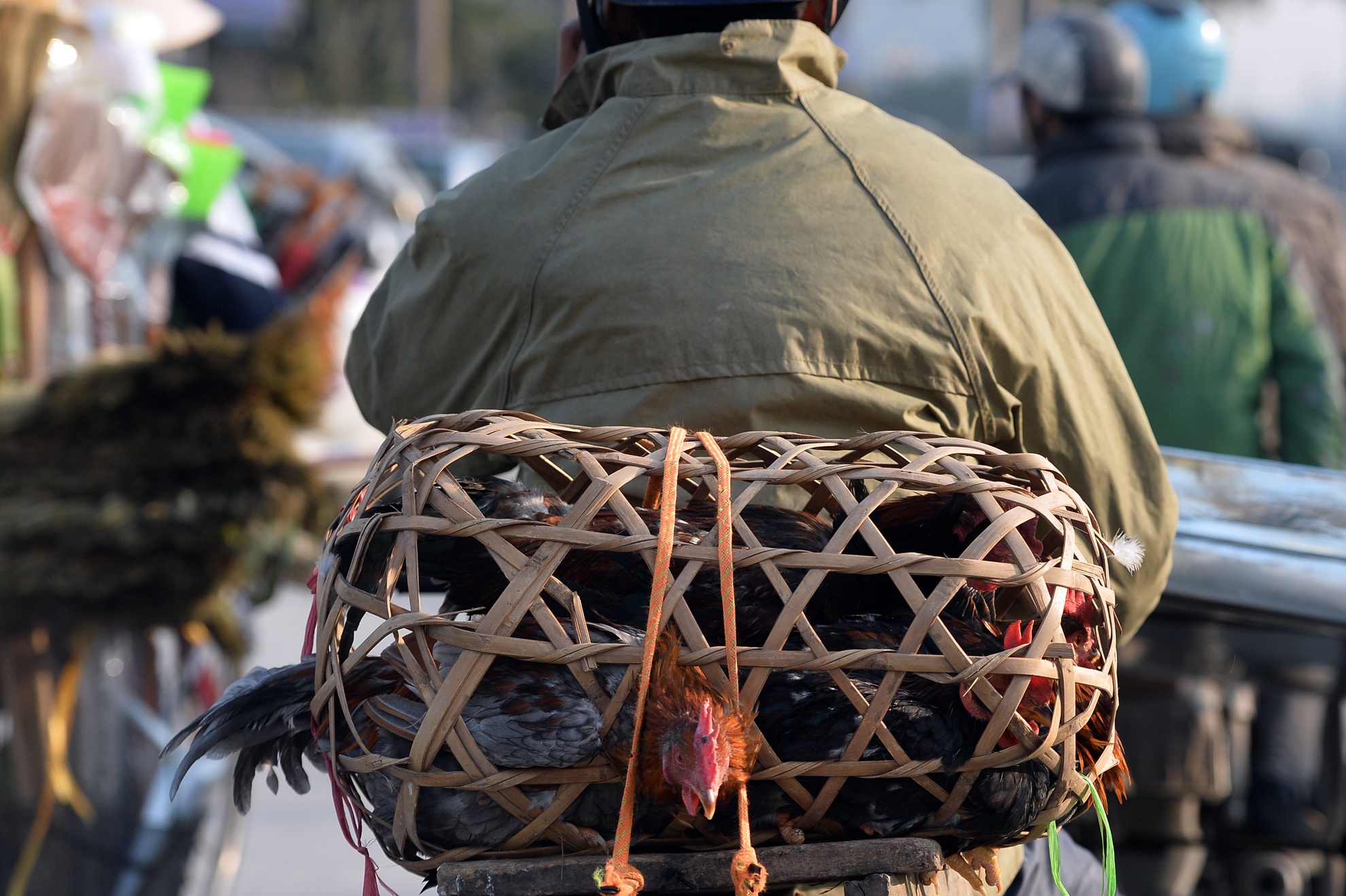 Đây còn là mùa mua sắm, nhiều người tranh thủ mưu sinh. Anh Bằng từ huyện Hoài Đức đèo mấy con gà nuôi của nhà vào trung tâm thủ đô bán.