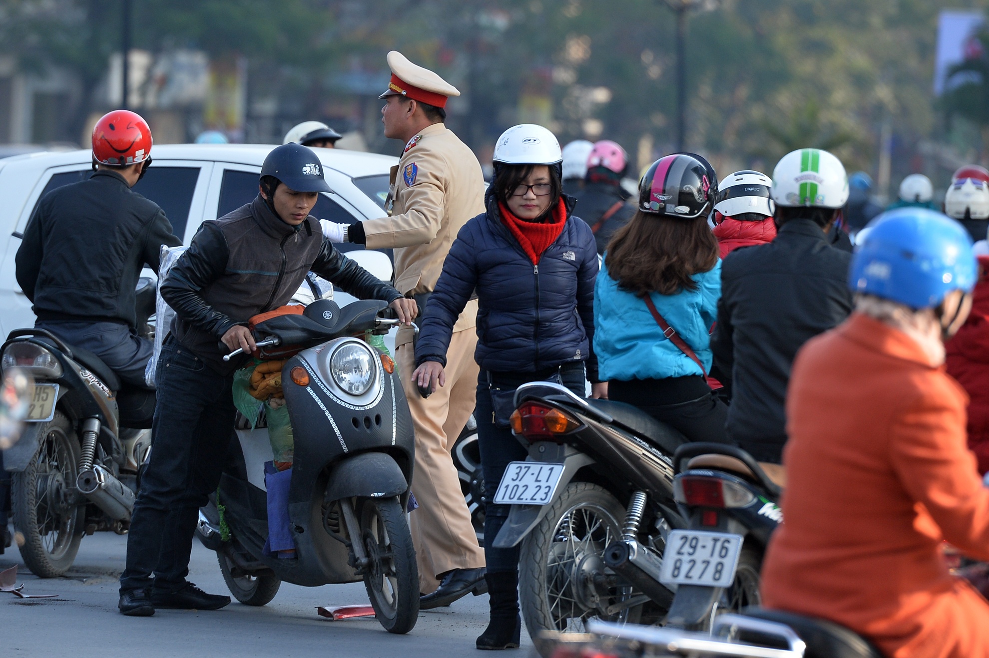 Đường đông, hàng cồng kềnh đã khiến một cặp nam nữ đi xe máy bị ngã giữa ngã tư sáng 22/1.