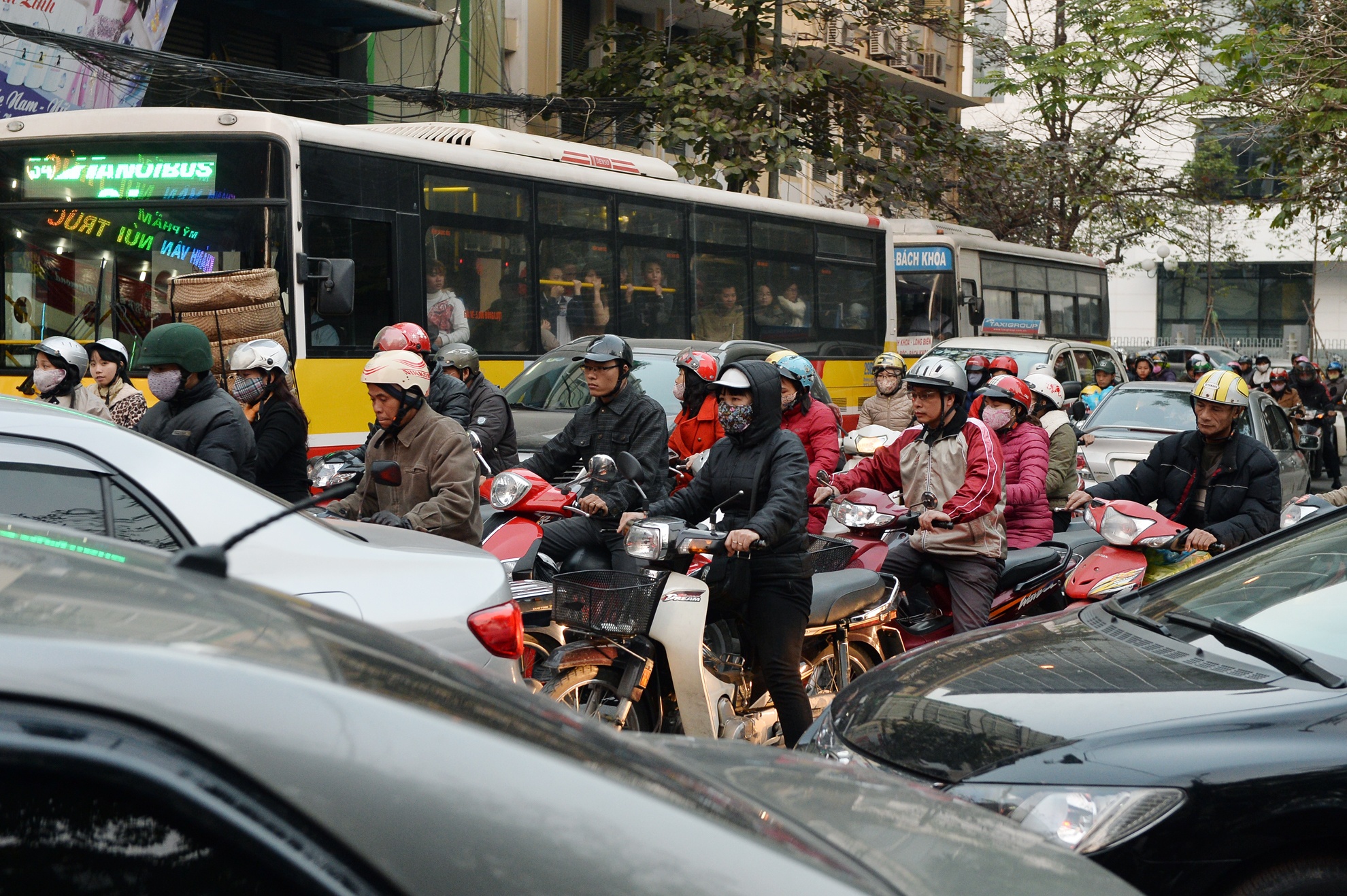 Toàn tuyến đường Lê Duẩn từ ngã ba Trần Hưng Đạo đến ngã tư Đại Cồ Việt - Giải Phóng, xe máy nhích từng mét.