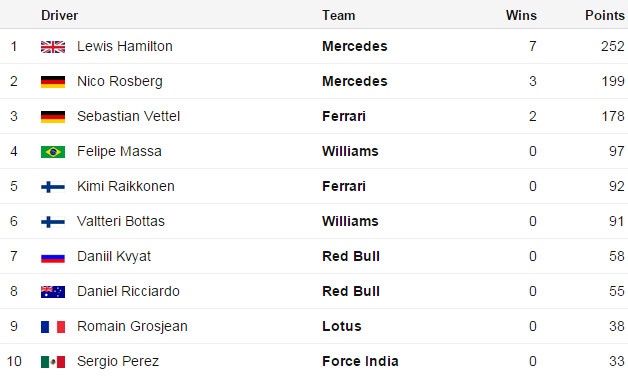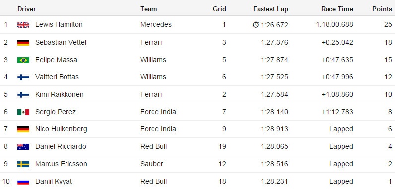 | Với 25 điểm giành được cùng việc đối thủ chính và cũng là đồng đội Nico Rosberg phải bỏ cuộc ở vòng áp chót, Hamilton hiện bỏ xa tay đua người Đức tới 53 điểm trong khi mùa giải còn 7 chặng nữa. |