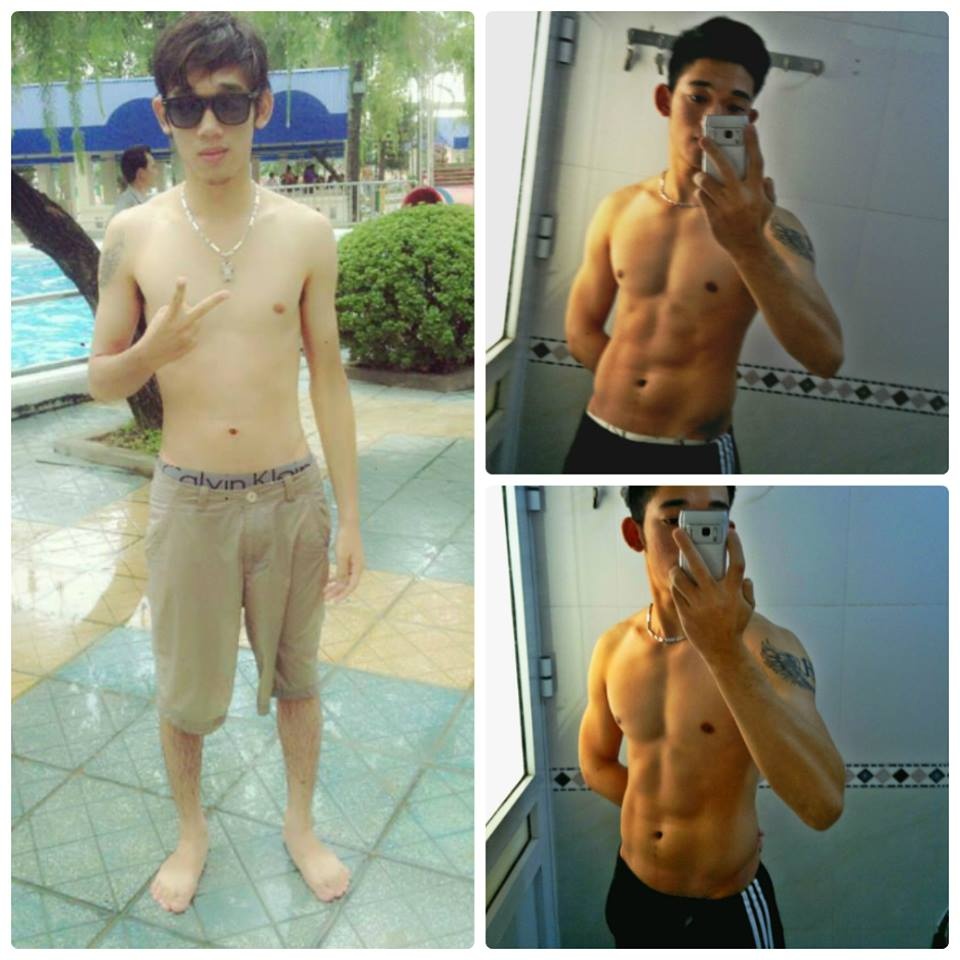 Về ngoại hình: trước khi đi tập gym tôi nặng 56 kg, sau 7 tháng, cân nặng tăng lên 65 kg. Cơ thể săn chắc, khỏe khoắn, có cơ bụng 6 múi.