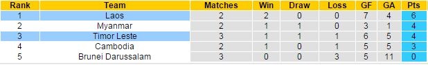 Trong khi với lợi thế sân nhà, Lào đang băng băng về đích sau 2 chiến thắng thuyết phục trước Campuchia và Brunei. Dẫu vậy, đội bóng của đất nước triệu voi cũng cần hết sức đề phòng bởi ở 2 lượt trận cuối, họ sẽ lần lượt chạm trán hai đối thủ cạnh tranh thực tiếp là Đông Timor và Myanmar.