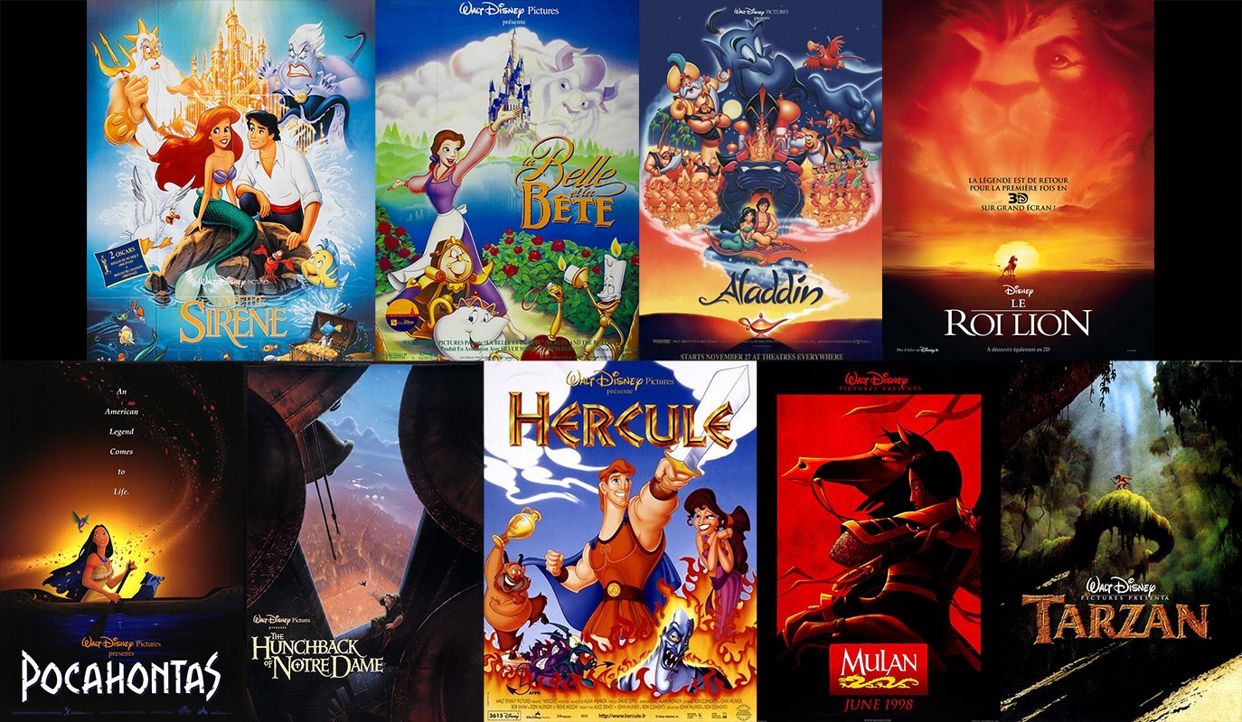 | Thời kỳ Phục Hưng của Disney bao gồm các tác phẩm: Nàng tiên cá, Người đẹp và quái vật, Aladdin, Vua sư tử, Pocahontas, Thằng gù ở Nhà thờ Đức Bà, Hercules, Mộc Lan và Tarzan. |