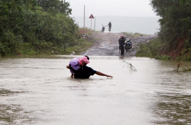 Nhiều phụ huynh không muốn con em mình nghỉ học, đã liều mình lội qua dòng nước chảy cuồn cuộn đưa con đến trường, sau đó lại lội qua suối đón con về nhà.