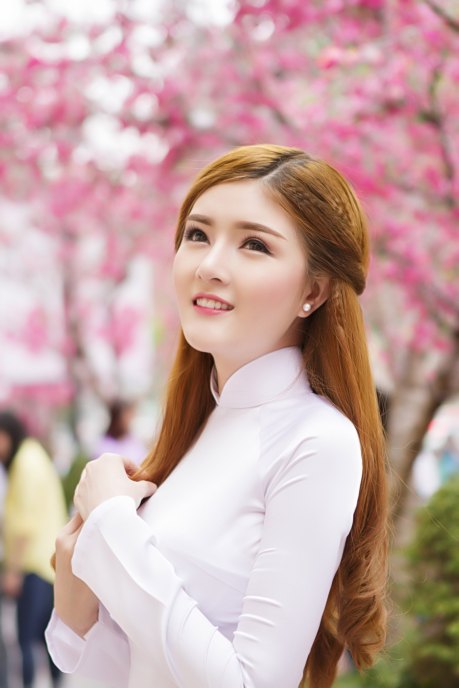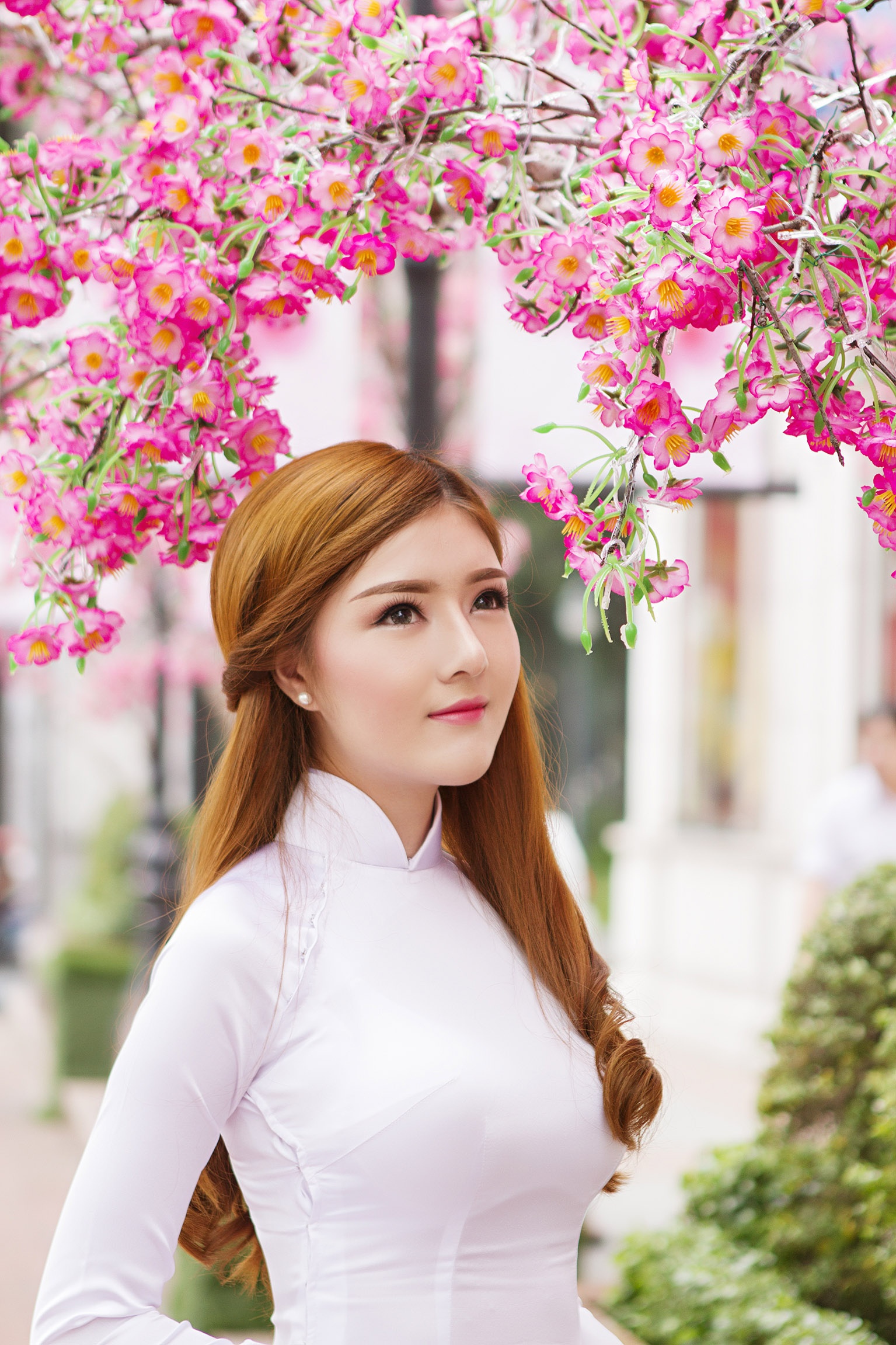 Nữ diễn viên - người mẫu ảnh diện áo dài truyền thống tông trắng thanh lịch, tản bộ trên những con phố tràn ngập không khí mùa xuân 2015.