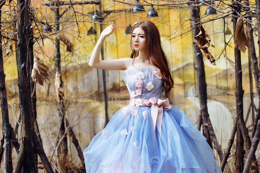 | Trong bộ ảnh thời trang mới, Lily biến hóa với hình ảnh cô dâu duyên dáng. Trang phục váy cưới gam màu xanh trong xếp tầng trẻ trung, mềm mại rất phù hợp với hình tượng trong sáng của nữ người mẫu. |