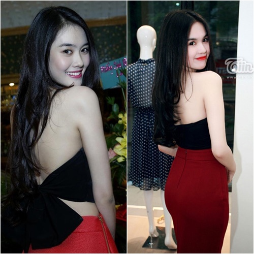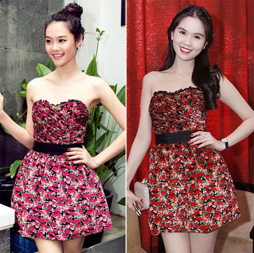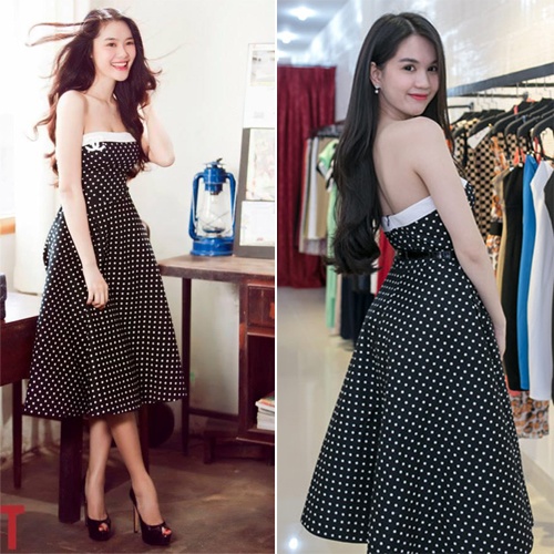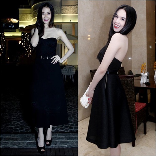 Hai chiếc váy giống nhau như đúc chỉ khác về màu sắc. Cùng một kiểu dáng nhưng ngoại hình thanh mảnh và vẻ đẹp nữ tính Linh Chi được đánh giá là duyên dáng hơn Ngọc Trinh.