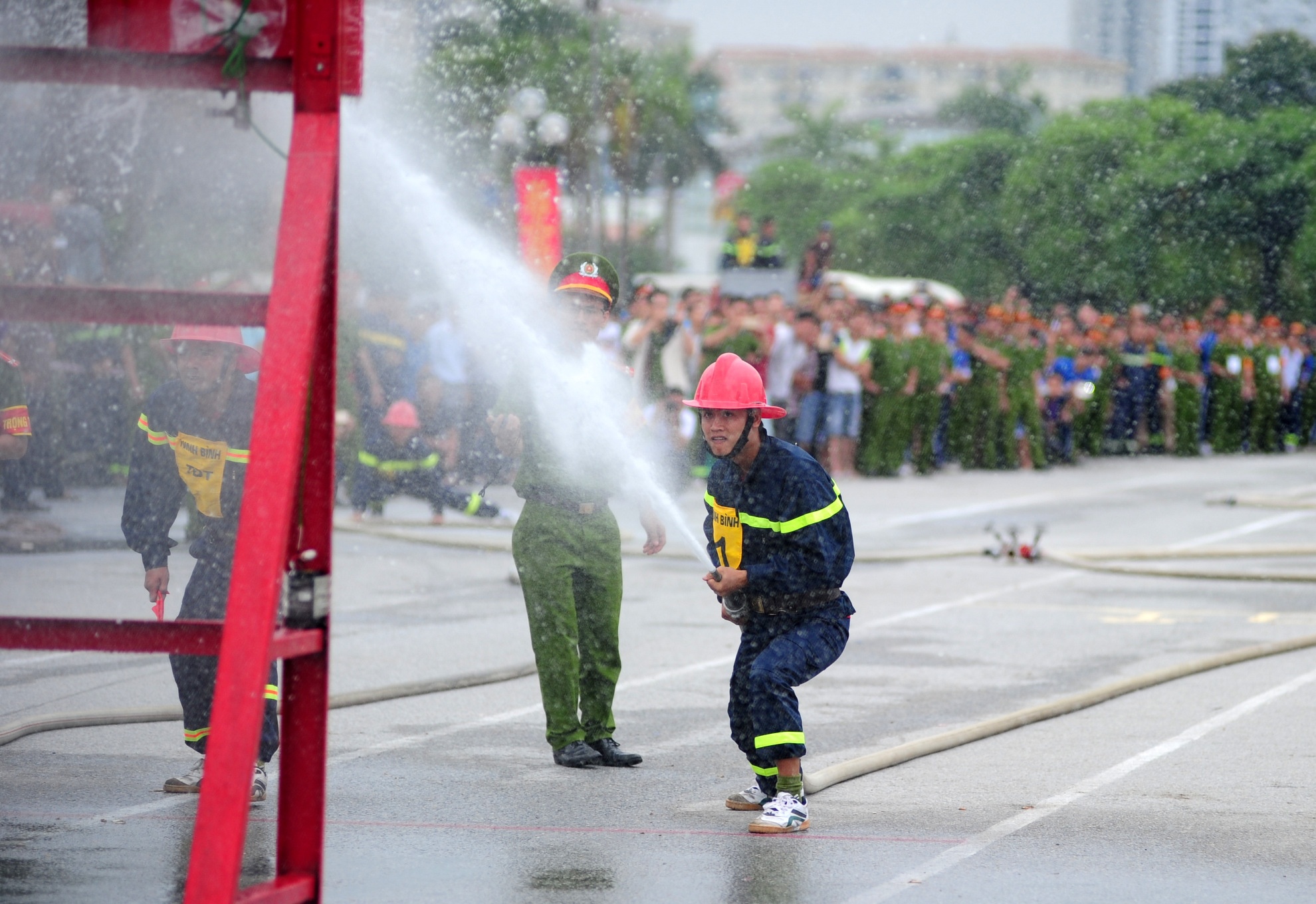 Lực lượng phòng cháy chữa cháy toàn quốc vừa có buổi trình diễn và thi tài cứu hộ, cứu nạn tại Quảng trường Mỹ Đình (Hà Nội), sáng 1/8 .