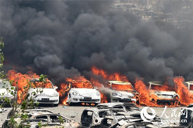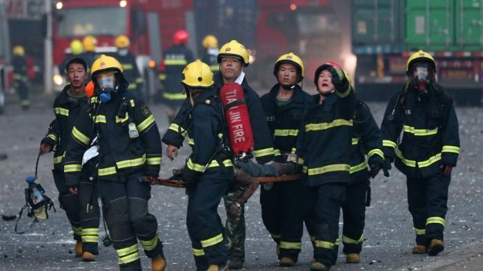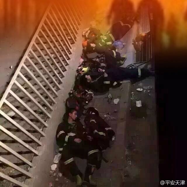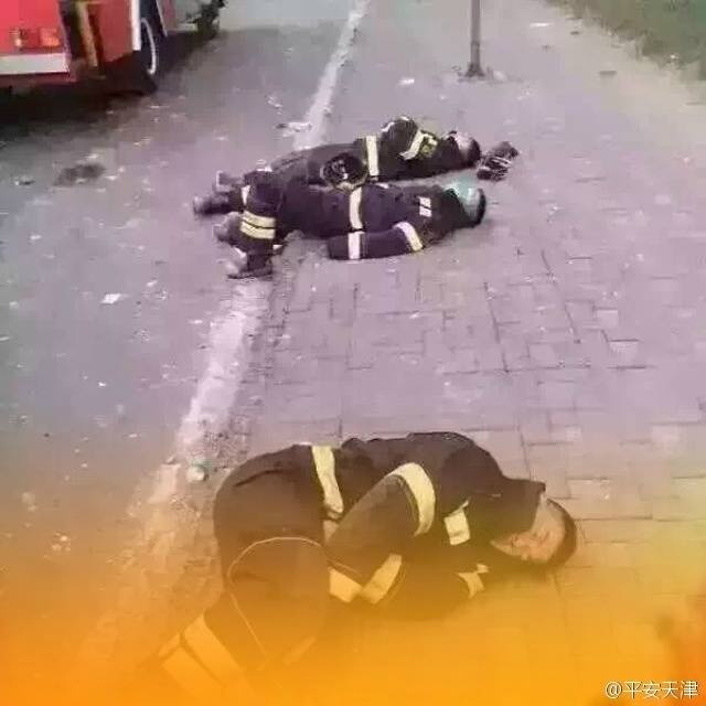 Hàng chục lính cứu hỏa Trung Quốc nằm la liệt trên các đường phố sau khi chữa cháy trong hơn 30 giờ tại hiện trường vụ nổ nhà kho ở thành phố cảng Thiên Tân.