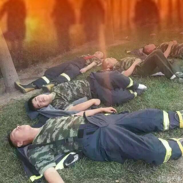 | Nhiều lính cứu hỏa nằm trên bãi cỏ để nghỉ ngơi sau nhiều giờ làm việc vất vả. Sáng 13/8, giới chức Trung Quốc phải tạm dừng hoạt động cứu hỏa để các chuyên gia xác định chắc chắn những hàng hóa trong nhà kho thuộc cảng Thiên Tân. Ảnh: Shanghaiist |