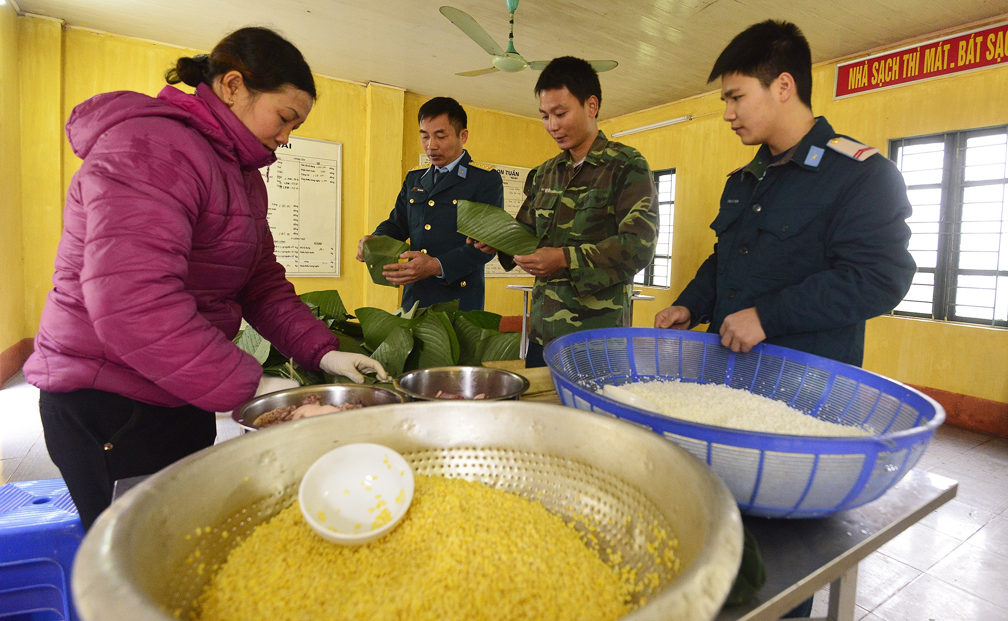 Cùng ngày, các cán bộ, chiến sĩ tiểu đoàn hậu cần cũng tất bật gói bánh chưng. Sau khi hoàn thành, bánh sẽ được phân phát về từng đội để đón Tết.