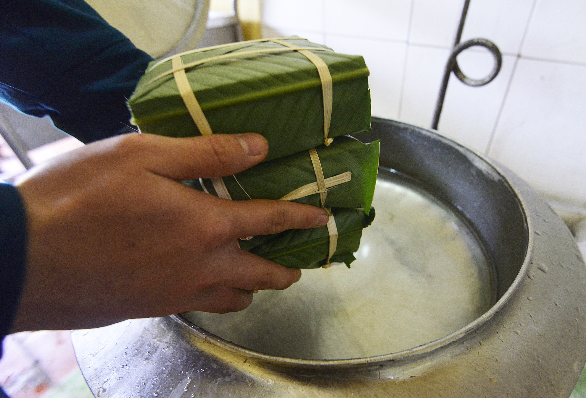 | Các chiến sĩ dùng nồi áp suất cỡ lớn để luộc bánh. |