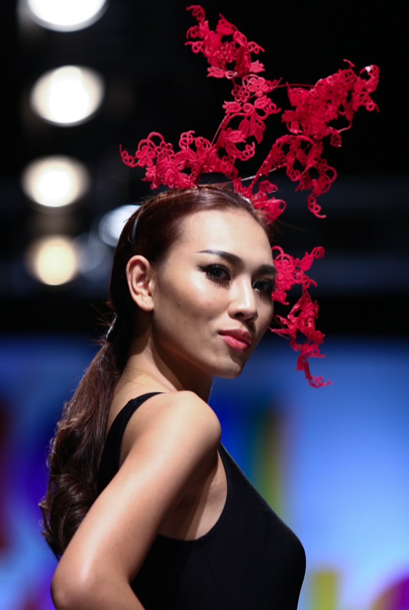 Người mẫu Khánh Phương trình diễn một mẫu phụ kiện cài tóc làm bằng ren.